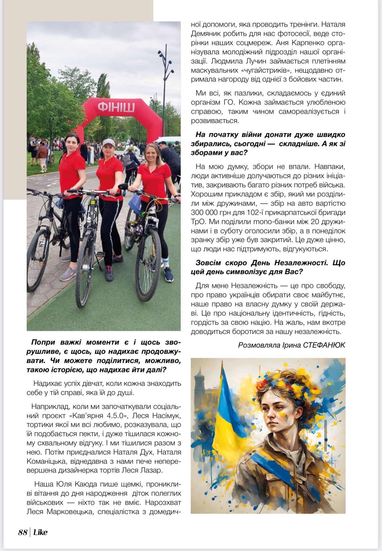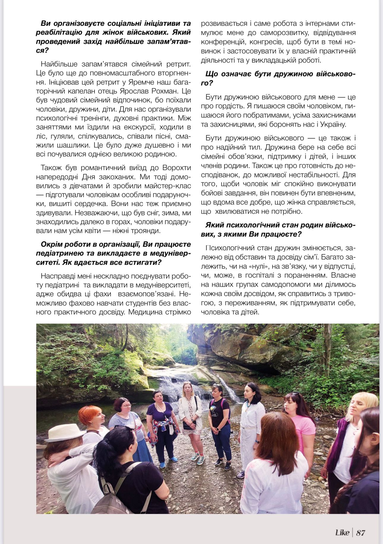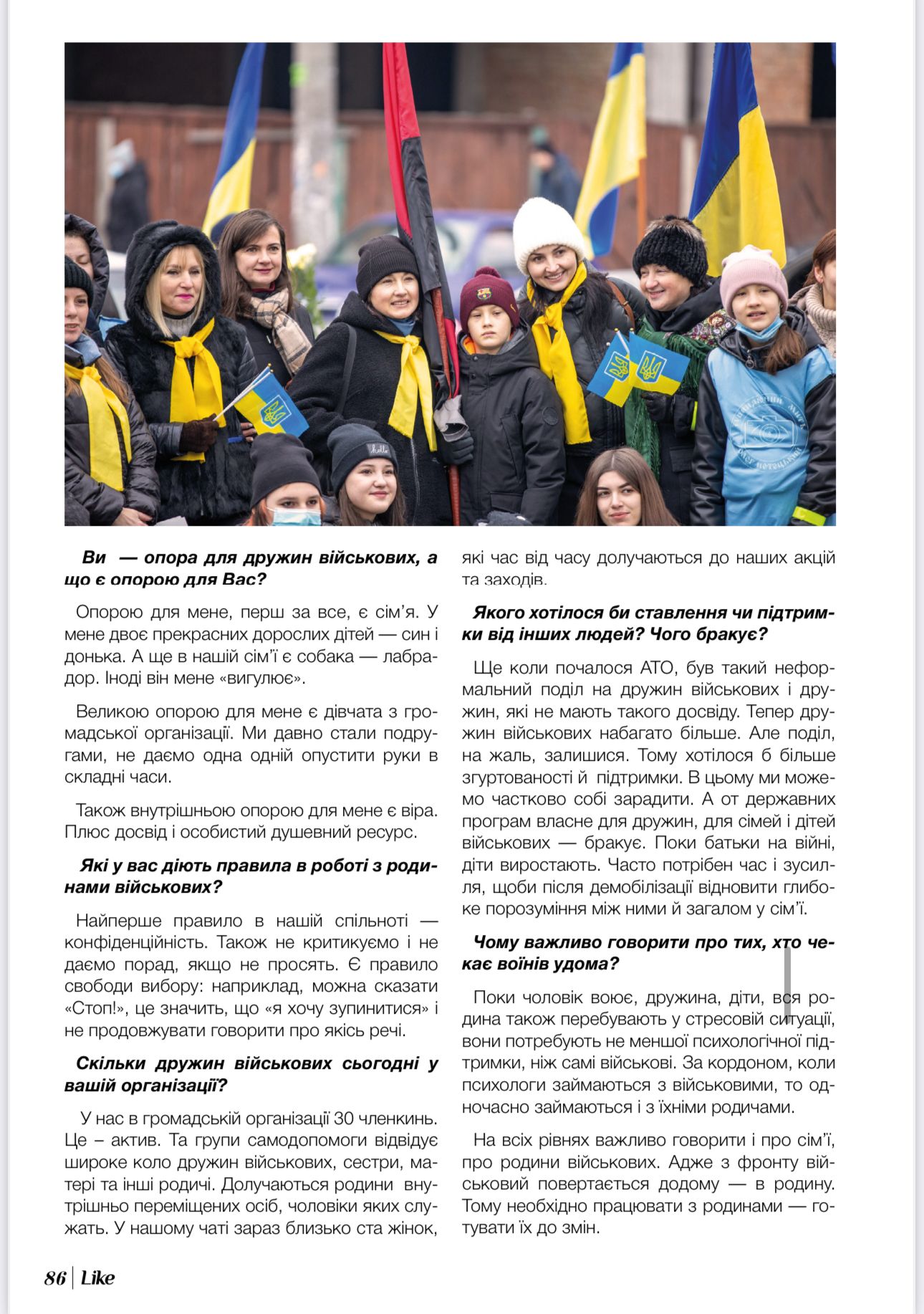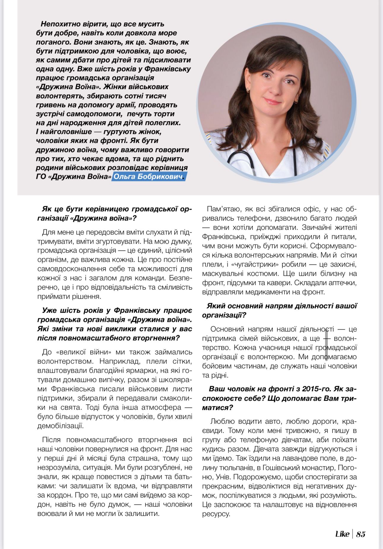 Непохитно вірити, що все мусить бути добре, навіть коли довкола море поганого. Вони знають, як це. Знають, як бути підтримкою для чоловіка, що воює, як самим дбати про дітей та підсилювати одна одну. Вже шість років у Франківську працює громадська організація «Дружина Воїна». Жінки військових волонтерять, збирають сотні тисяч гривень на допомогу армії, проводять зустрічі самодопомоги, печуть торти на дні народження для дітей полеглих.