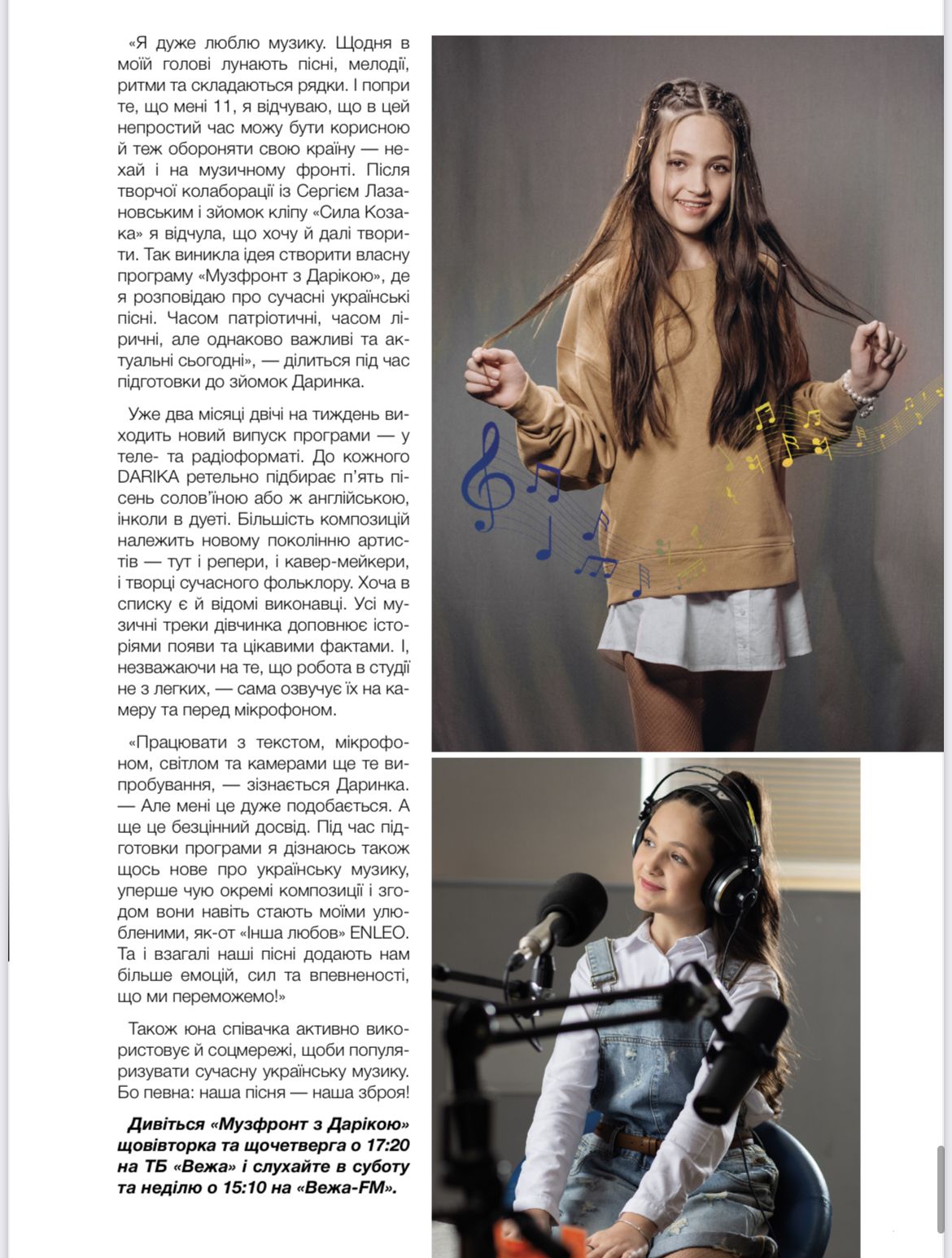 Поки дорослі дають гідну відсіч ворогові на всіх можливих напрямках, а все укра- їнське впевнено завойовує світ, вона теж вирішила не сидіти склавши рук і відкрила тут, у Франківську, свій фронт — музичний. Юна співачка ДАРИНКА ЛУЦЬКА, відома як DARIKA, започаткувала власну авторську програму. З екранів ТБ та на ФМ-хвилях дівчинка розповідає про нові українські пісні, які несуть у собі незламний дух, опти- мізм та віру в перемогу. За лаштунками зйомок одного із випусків побували й Like!