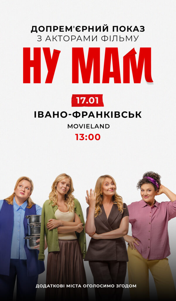 22 січня 2026 року в українських кінотеатрах стартує прем’єра сімейної комедії «Ну мам» — зворушливої та смішної історії про матерів, дітей і ті моменти, які проживає кожна родина. Стрічка «Ну мам» — це тепла історія про любов, незалежність, прийняття та безумовну турботу. Фільм складається з кількох переплетених сюжетних ліній, які показують різні типи стосунків між матерями та дітьми — від раннього дитинства до дорослого життя.