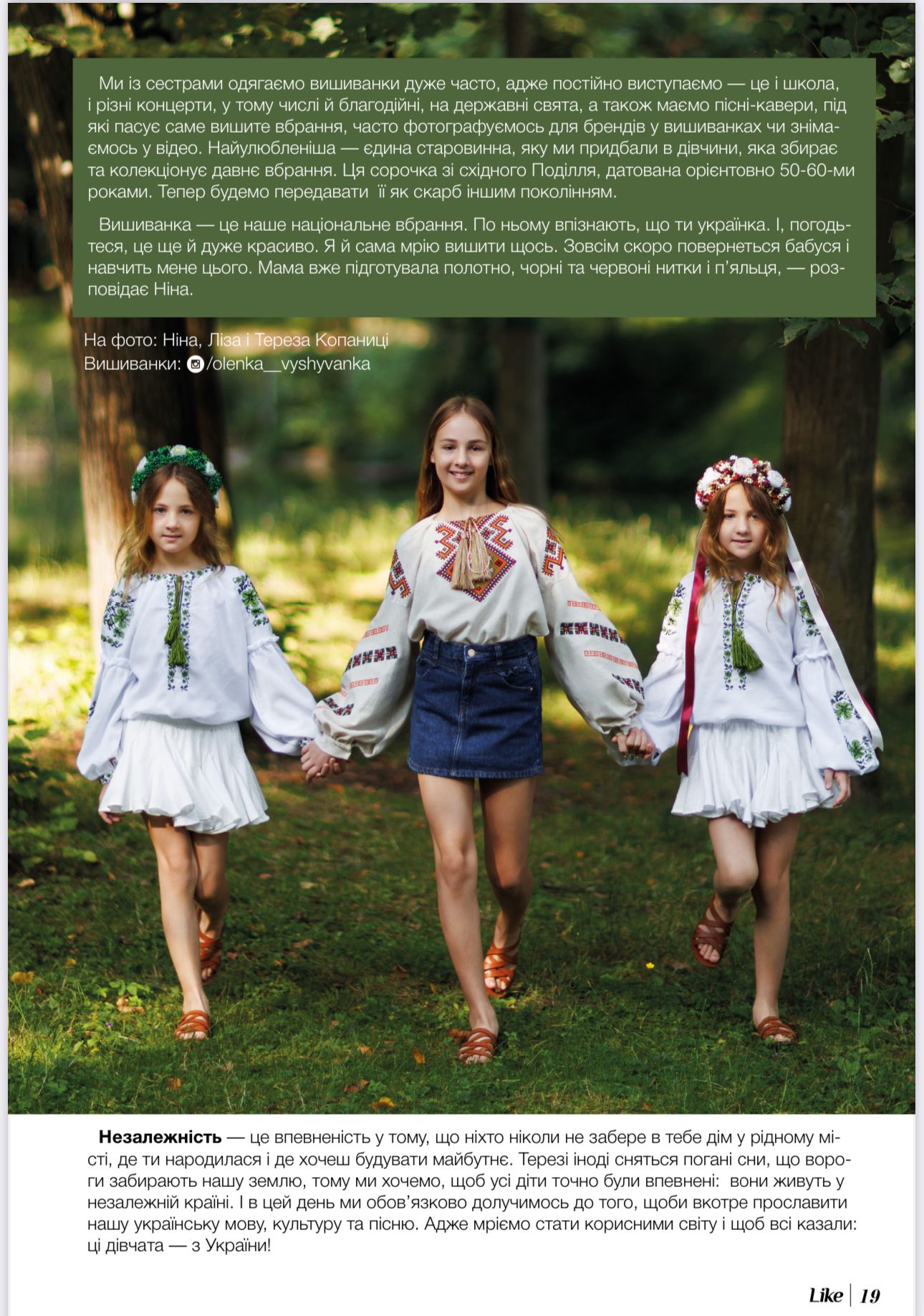 Вишиванка — це наше національне вбрання. По ньому впізнають, що ти українка. І, погодьтеся, це ще й дуже красиво. Я й сама мрію вишити щось. Зовсім скоро повернеться бабуся і навчить мене цього. Мама вже підготувала полотно, чорні та червоні нитки і пʼяльця, – розповідає Ніна.