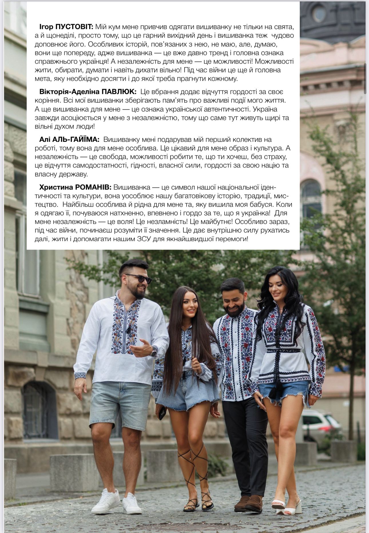 Алі АЛЬ-ГАЙЇМА: Вишиванку мені подарував мій перший колектив на роботі, тому вона для мене особлива. Це цікавий для мене образ і культура. А незалежність — це свобода, можливості робити те, що ти хочеш, без страху, це відчуття самодостатності, гідності, власної сили, гордості за свою націю та власну державу.