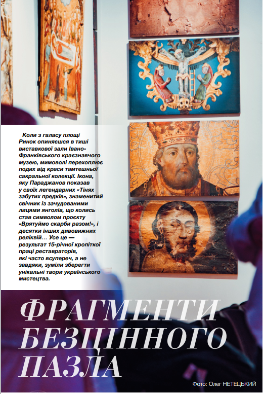 Коли з галасу площі Ринок опиняєшся в тиші виставкової зали Івано-Франківського краєзнавчого музею, мимоволі перехоплює подих від краси тамтешньої сакральної колекції. Ікона, яку Параджанов показав у своїх легендарних «Тінях забутих предків», знаменитий свічник із зачудованими лицями янголів, що колись став символом проєкту «Врятуймо скарби разом!», і десятки інших дивовижних реліквій… Усе це — результат 15-річної кропіткої праці реставраторів, які часто всупереч, а не завдяки, зуміли зберегти унікальні твори українського мистецтва.