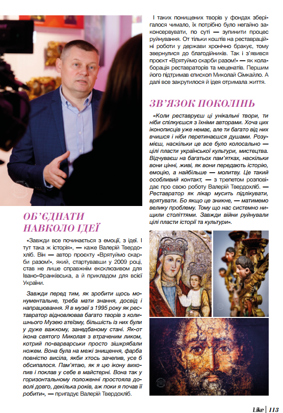 «Ми показали це інклюзивне видання колегам у Польщі і вони були вражені, бо ще не видавали таких альбомів з сакральними творами. Для них це було дуже цікаво. А ми спробували і зробили, — розповідає реставратор. — І багато людей в Україні, до речі, надихаються проєктом «Врятуймо скарби разом!», пишуть мені. Це важливо — запалювати людей, заряджати на рух, дослідження, роботу».На певному етапі проєкт вийшов за межі музейної збірки. До Валерія Твердохліба почали звертатися представники громад із проханням відреставрувати ікони з їхніх храмів.«Ти розумієш, що пам’ятка унікальна і не маєш права не зберегти її, тому в позаробочий час стаєш і робиш, — усміхається реставратор. — Це історія постійної праці, розвитку для цієї країни і наступних поколінь. Я не знаю, скільки Бог мені дав життя, але ти кожен день маєш проживати по максимуму. Залишати після себе щось якісне, яскраве, світле й прекрасне. Ти працюєш і бачиш плоди цього за 15 років. Якщо воно ще живе, — значить комусь потрібно. Як каже добрий друг нашого проєкту Ярема Стецик: «Треба підкидати дров у той вогонь».