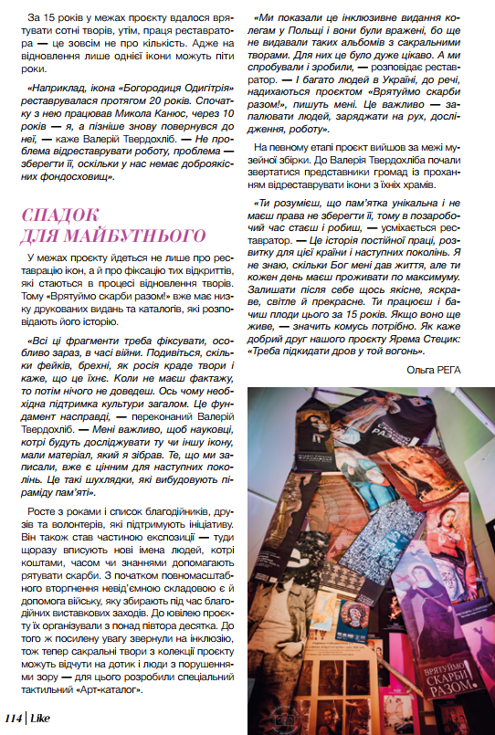 У межах проєкту йдеться не лише про реставрацію ікон, а й про фіксацію тих відкриттів, які стаються в процесі відновлення творів. Тому «Врятуймо скарби разом!» вже має низку друкованих видань та каталогів, які розповідають його історію.«Всі ці фрагменти треба фіксувати, особливо зараз, в часі війни. Подивіться, скільки фейків, брехні, як росія краде твори і каже, що це їхнє. Коли не маєш фактажу, то потім нічого не доведеш. Ось чому необхідна підтримка культури загалом. Це фундамент насправді, — переконаний Валерій Твердохліб. — Мені важливо, щоб науковці, котрі будуть досліджувати ту чи іншу ікону, мали матеріал, який я зібрав. Те, що ми записали, вже є цінним для наступних поколінь. Це такі шухлядки, які вибудовують піраміду пам’яті».Росте з роками і список благодійників, друзів та волонтерів, які підтримують ініціативу. Він також став частиною експозиції — туди щоразу вписують нові імена людей, котрі коштами, часом чи знаннями допомагають рятувати скарби. З початком повномасштабного вторгнення невід’ємною складовою є й допомога війську, яку збирають під час благодійних виставкових заходів. До ювілею проєкту їх організували з понад півтора десятка. До того ж посилену увагу звернули на інклюзію, тож тепер сакральні твори з колекції проєкту можуть відчути на дотик і люди з порушеннями зору — для цього розробили спеціальний тактильний «Арт-каталог».