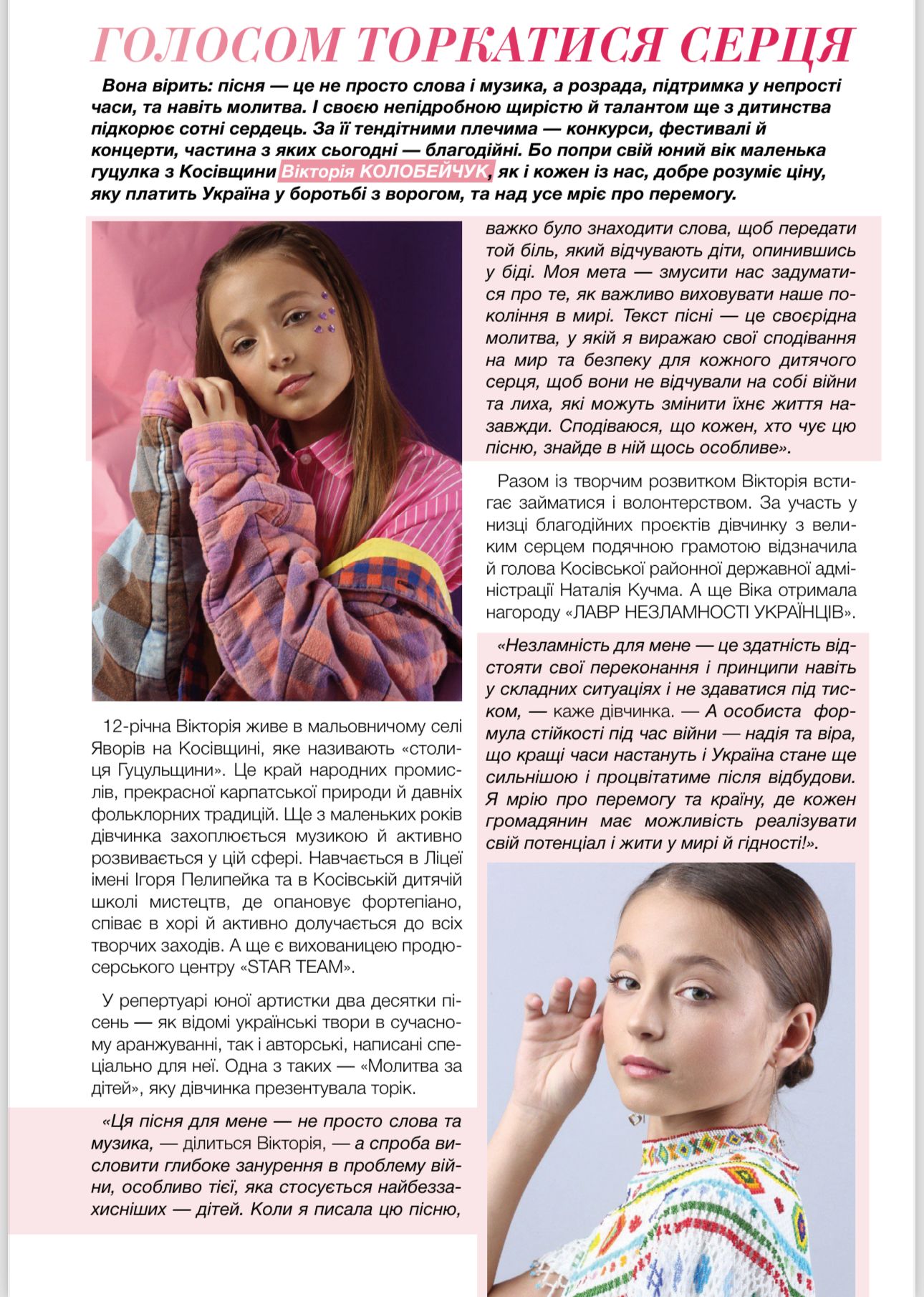 Вона вірить: пісня — це не просто слова і музика, а розрада, підтримка у непрості часи, та навіть молитва. І своєю непідробною щирістю й талантом ще з дитинства підкорює сотні сердець. За її тендітними плечима — конкурси, фестивалі й концерти, частина з яких сьогодні — благодійні. Бо попри свій юний вік маленька гуцулка з Косівщини Вікторія КОЛОБЕЙЧУК, як і кожен із нас, добре розуміє ціну, яку платить Україна у боротьбі з ворогом, та над усе мріє про перемогу.