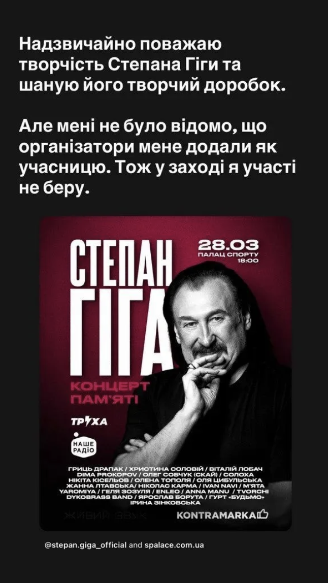“Надзвичайно поважаю творчість Степана Гіги і шаную його творчий доробок. Але мені не було відомо, що організатори мене додали як учасницю. Тож у заході я участі не беру”, – зазначила співачка.
