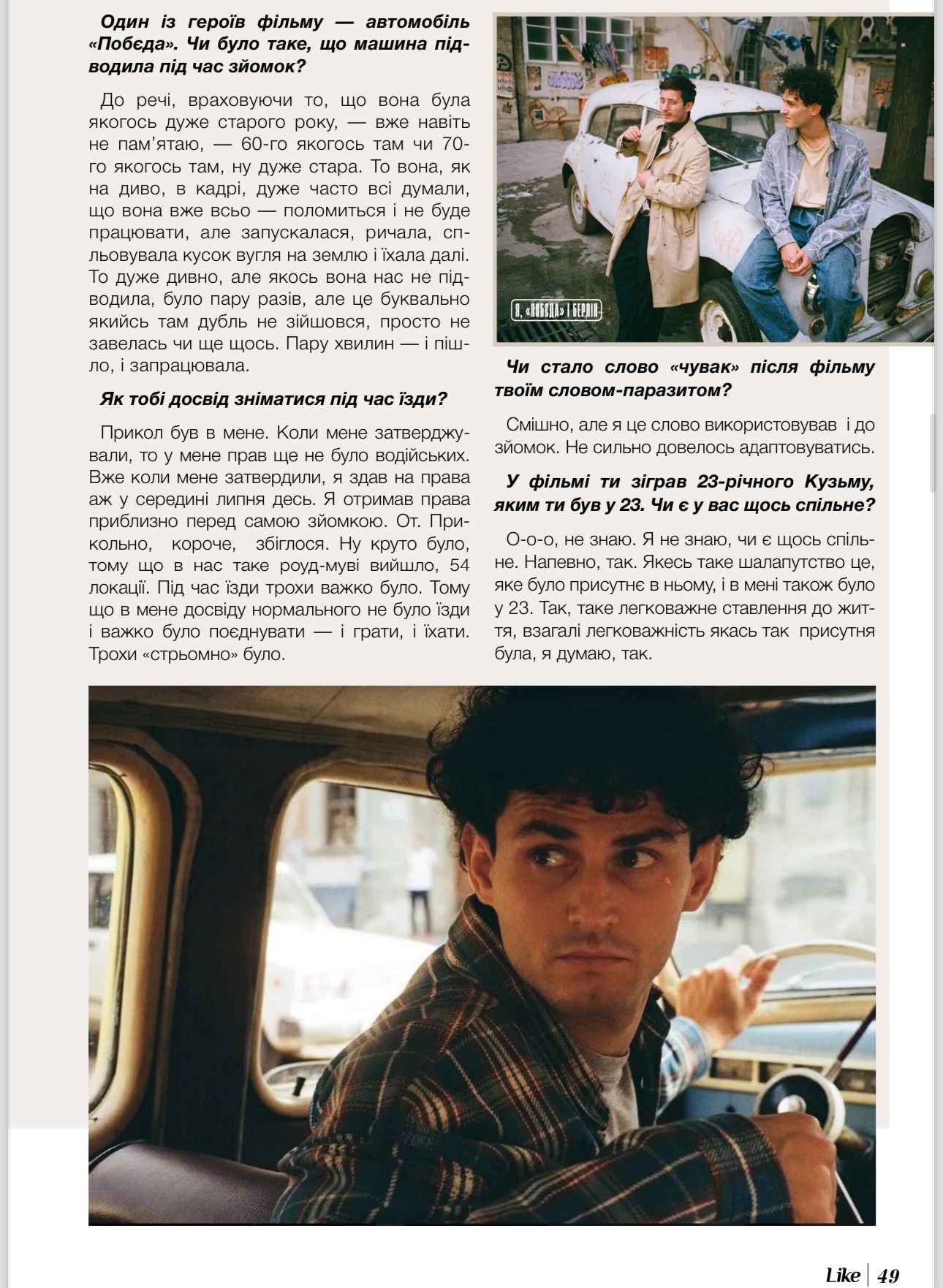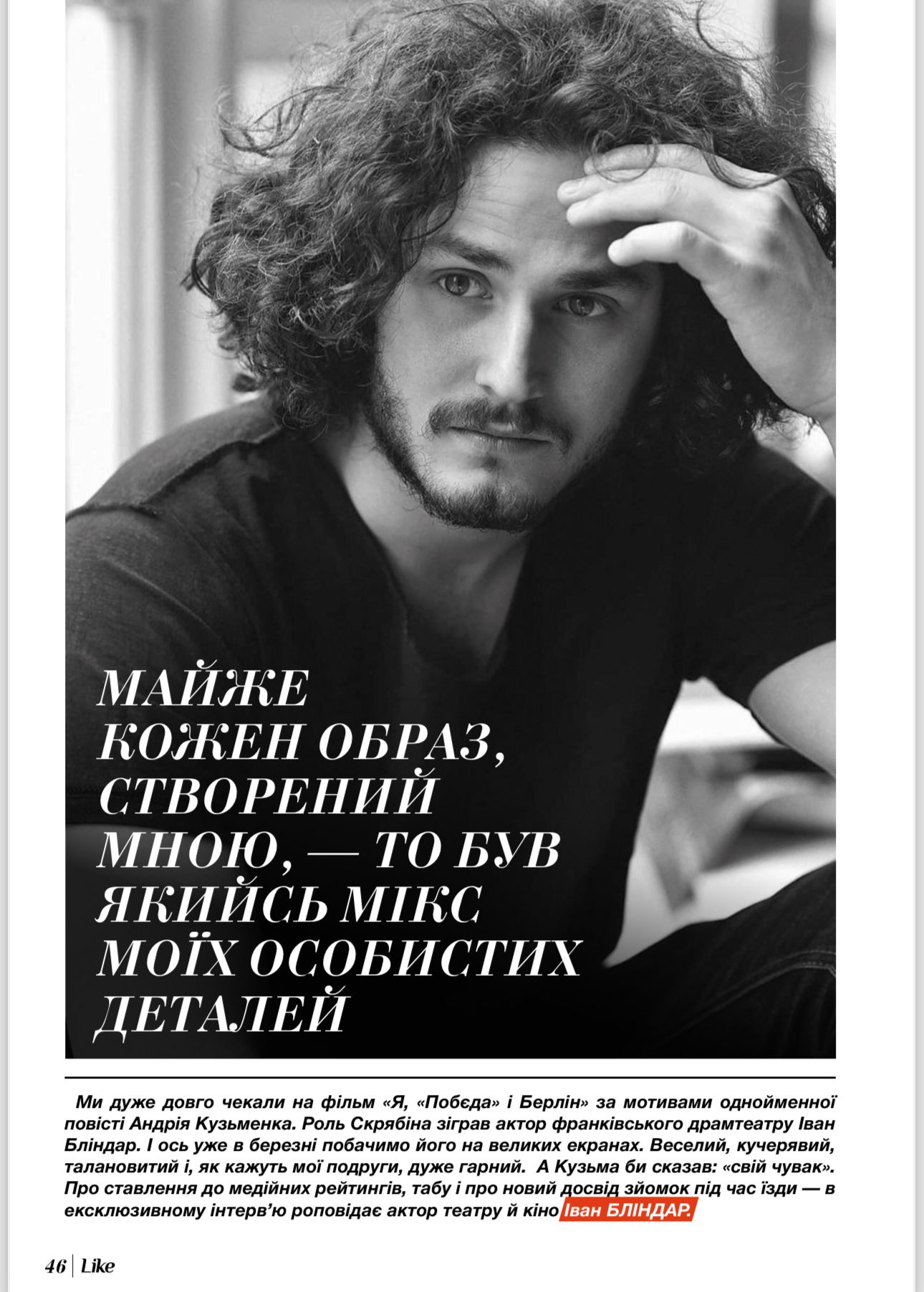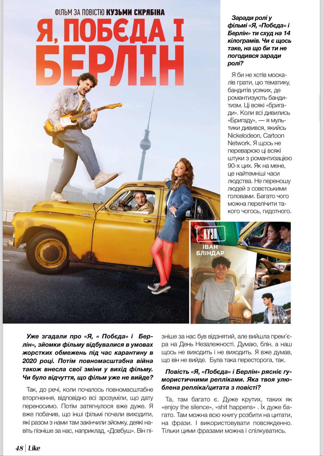 Ми дуже довго чекали на фільм «Я, «Побєда» і Берлін» за мотивами однойменної повісті Андрія Кузьменка. Роль Скрябіна зіграв актор франківського драмтеатру Іван Бліндар. І ось уже в березні побачимо його на великих екранах. Веселий, кучерявий, талановитий і, як кажуть мої подруги, дуже гарний. А Кузьма би сказав: «свій чувак».