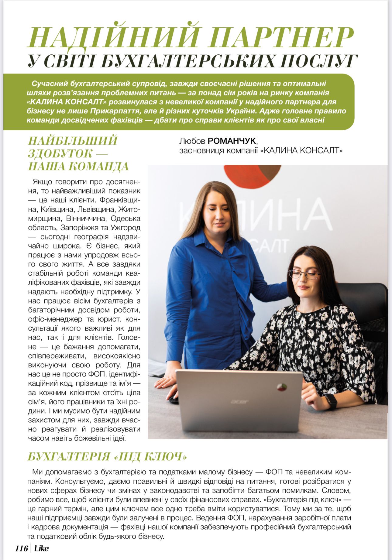 Сучасний бухгалтерський супровід, завжди своєчасні рішення та оптимальні шляхи розвʼязання проблемних питань — за понад сім років на ринку компанія «КАЛИНА КОНСАЛТ» розвинулася з невеликої компанії у надійного партнера для бізнесу не лише Прикарпаття, але й різних куточків України. Адже головне правило команди досвідчених фахівців — дбати про справи клієнтів як про свої власні