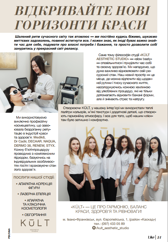 Саме тому філософія студії «KŪLT AESTHETIC STUDIO» — «slow beaty» — сповільнитися і приділити час собі та своєму здоров’ю. Ми нагадуємо, що дуже важливо відновлювати свій ресурсний стан. Наш новий простір — це місце, де можна відпочити від щоденної рутини і тиску сучасного життя, насолоджуючись кожною хвилиною від улюблених процедур, які не тільки допомагають відновити бажані форми, але й знімають стрес та напругу.