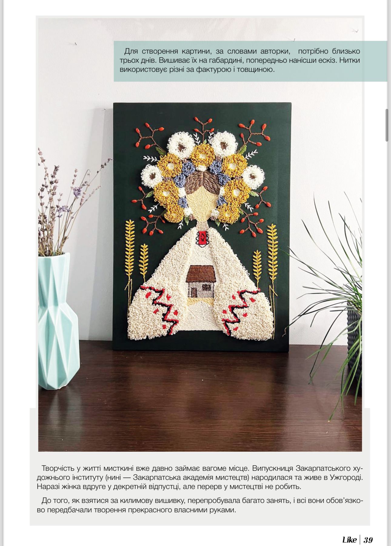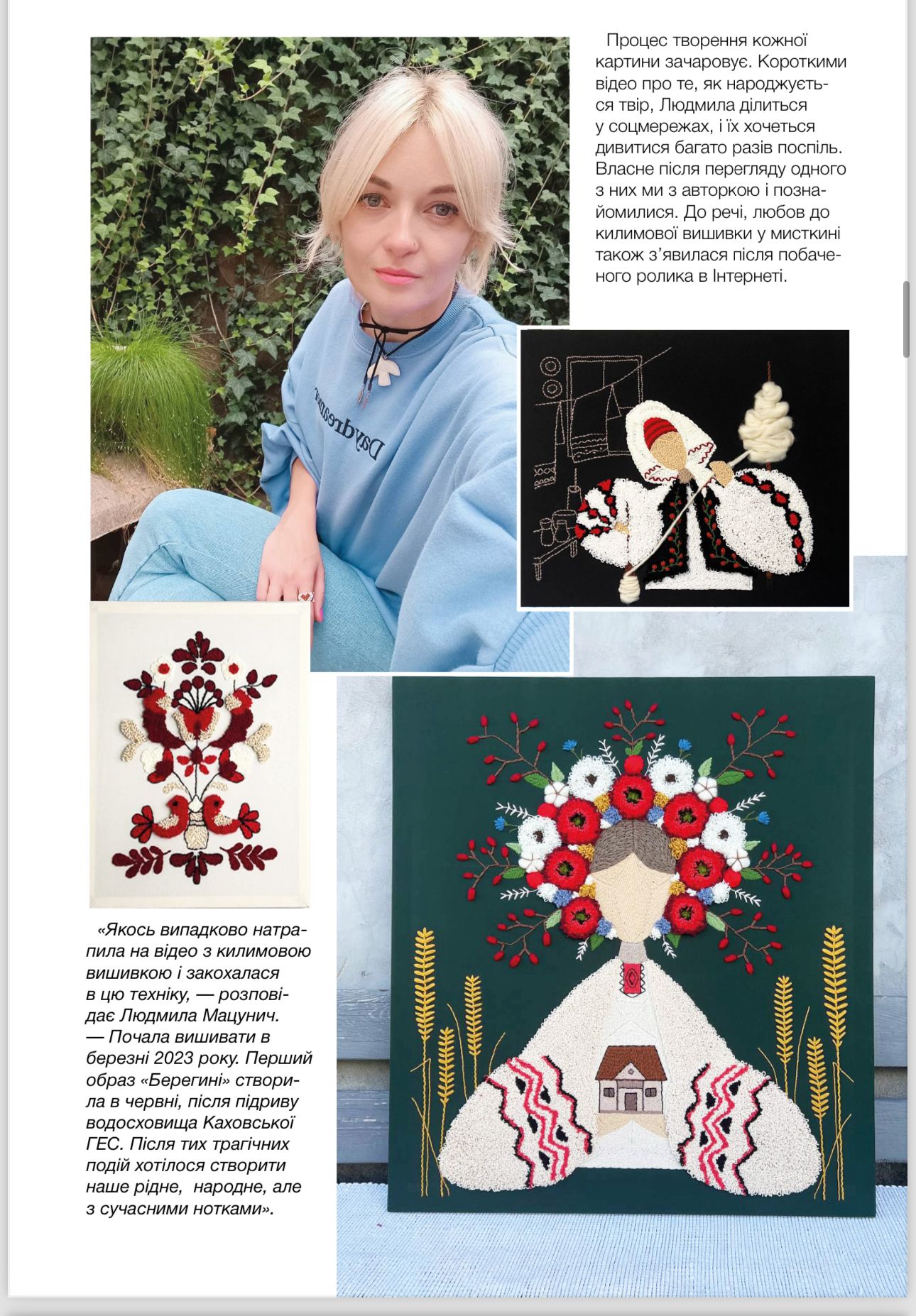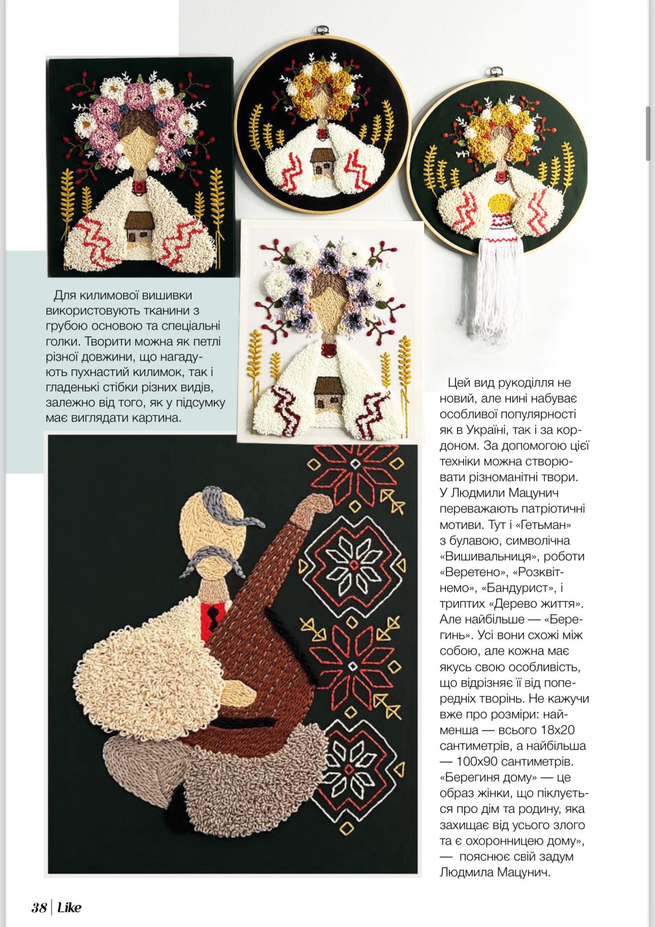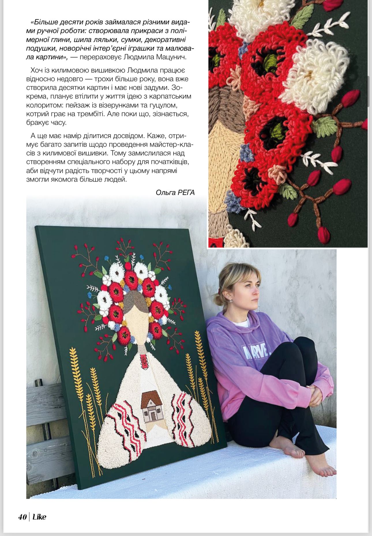 Стібок за стібком — вона творить на полотні барвисті квіти, вплетені у коси жінки, котра немов огортає собою рідний дім. Це «Берегиня» — одна з найпопулярніших робіт мисткині Людмили МАЦУНИЧ. Як народився цей образ та чим особлива техніка килимової вишивки, у якій створена картина, авторка розповіла журналу Like.