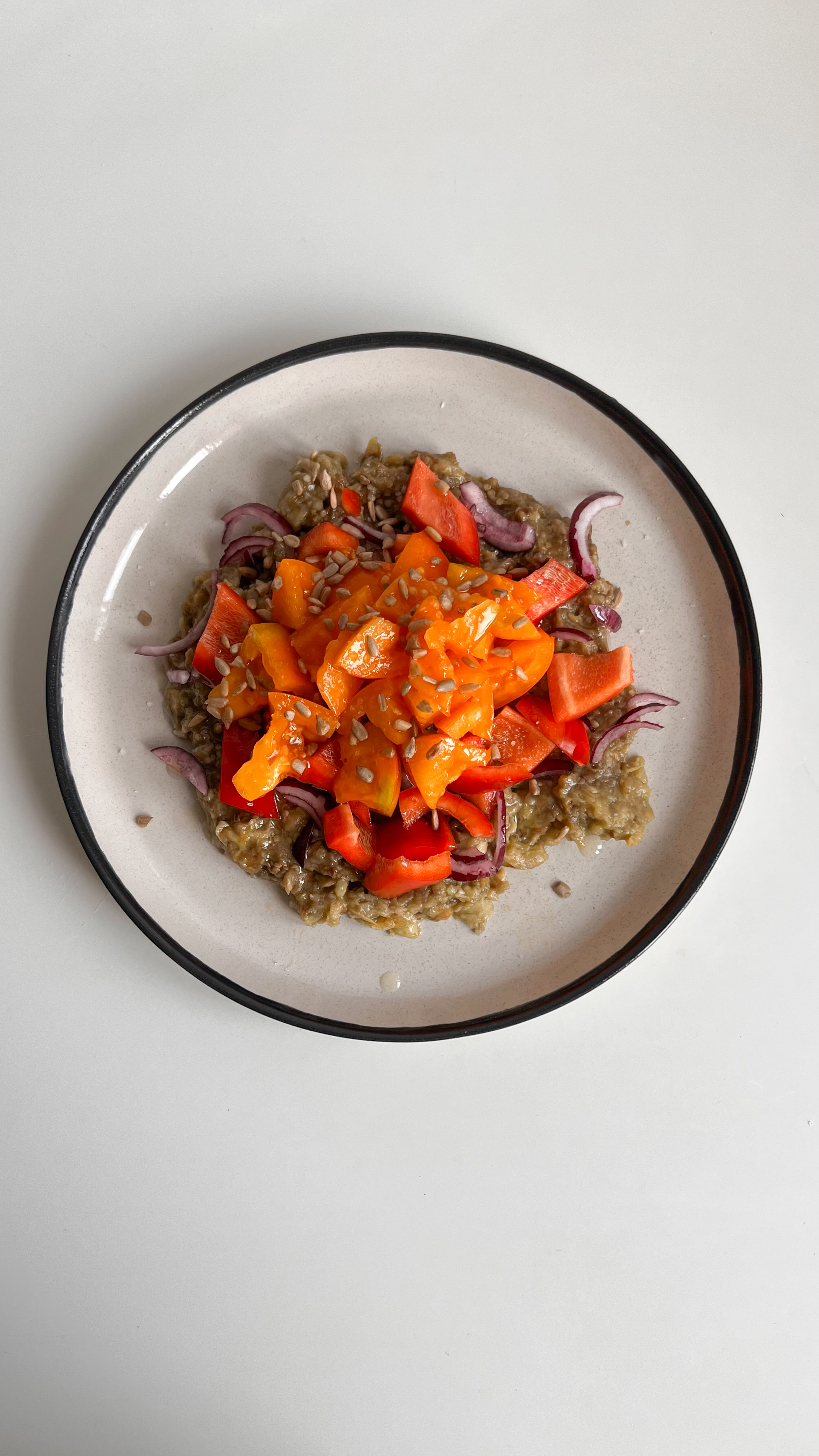 - Зверху додати нарізаний перець, помідори і цибулю. Полити олією та посолити. Додати насіння соняшнику.