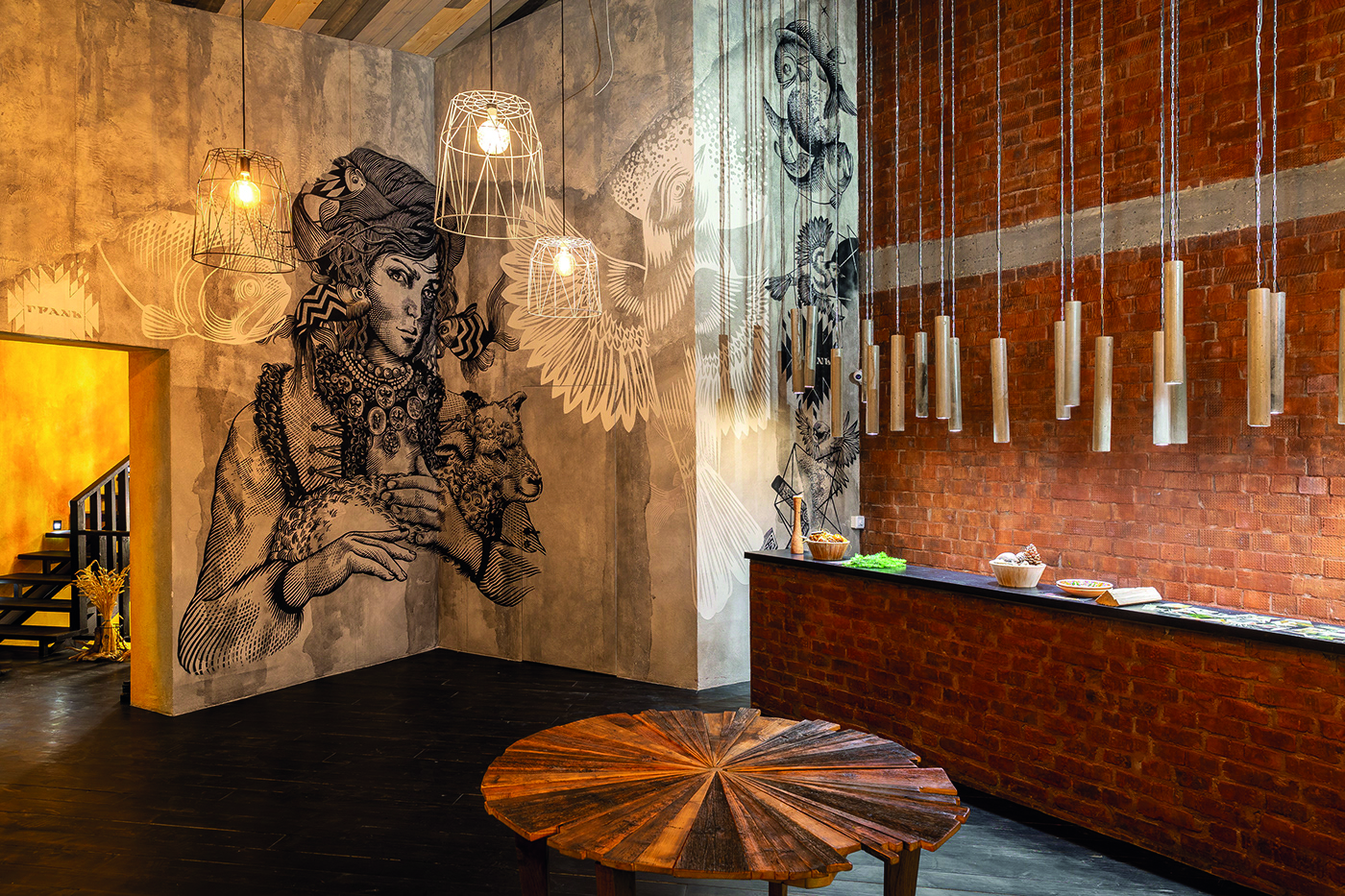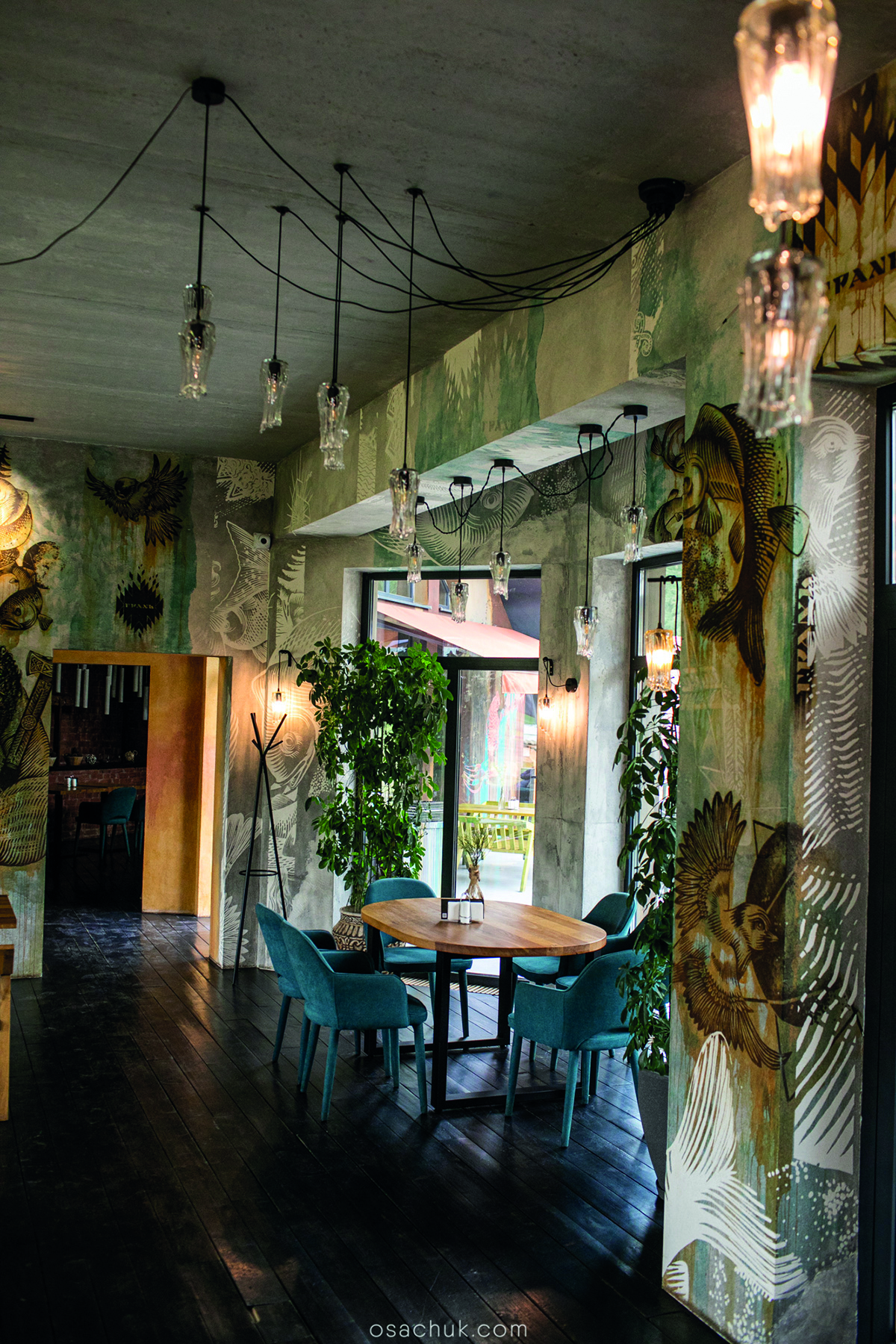 Це ще від тата така історія. Робить він, наприклад, якийсь великий актовий зал і з’являється там на стіні неймовірний величезний пейзаж. Здається, причім тут це, а він завжди говорив: «Мені потрібно, щоб цю хату щось тримало». І ми теж це пантруємо при зонуваннях, розміщеннях, знаходимо цей центр «тусовки». Ну що б то не було: чи це офіс, чи це ресторан, чи що, ну, тобто, якась річ має бути центром «тусовки». І тоді набагато комфортніше периферія сприймається. Має бути цей магніт. Якщо ти про це питаєш, значить спостерігала або щось там додивлялася. Не всі люди це відрізняють. Ясно, що десь можемо «спалитися» якимись малюночками, але дуже часто ми це робимо не в наших інтер’єрах, а в тих, де брали співучасть.