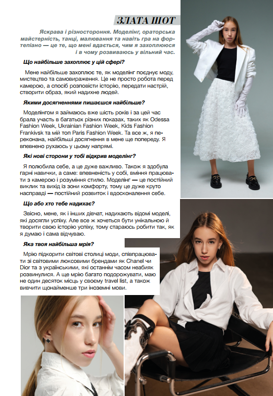 MiniModels: Злата Шот 0 By Ірина Стефанюк on 08.04.2025 · Новини Яскрава і різностороння. Моделінг, ораторська майстерність, танці, малювання та навіть гра на фортепіано — це те, що мені вдається, чим я захоплююся і в чому розвиваюсь у вільний час Share. Twitter Facebook Google+ Pinterest LinkedIn Tumblr Email