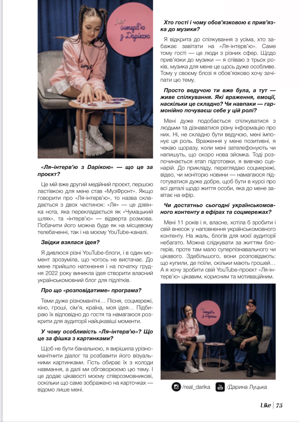 Українськомовного контенту забагато не буває. Як і запитів на нього. А якщо створювати продукт зі смаком, креативом та любов’ю, то, здавалося б, традиційна розмова у студії із легкістю перетворюється на цікавий змістовний проєкт. «Ля–інтерв’ю» — нова авторська програма франківської співачки Даринки Луцької, відомої як DARIKA. Про музику, творчість, таємниці зіркових гостей, натхнення, мотивацію і не тільки. Кого запрошуватиме до відвертого діалогу та