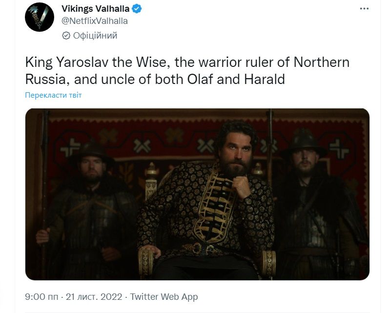 Стрімінговий сервіс назвав Ярослава Мудрого “правителем північної росії”. Відповідний твіт з’явився на офіційній сторінці серіалу “Вікінги: Вальгалла” у Twitter.