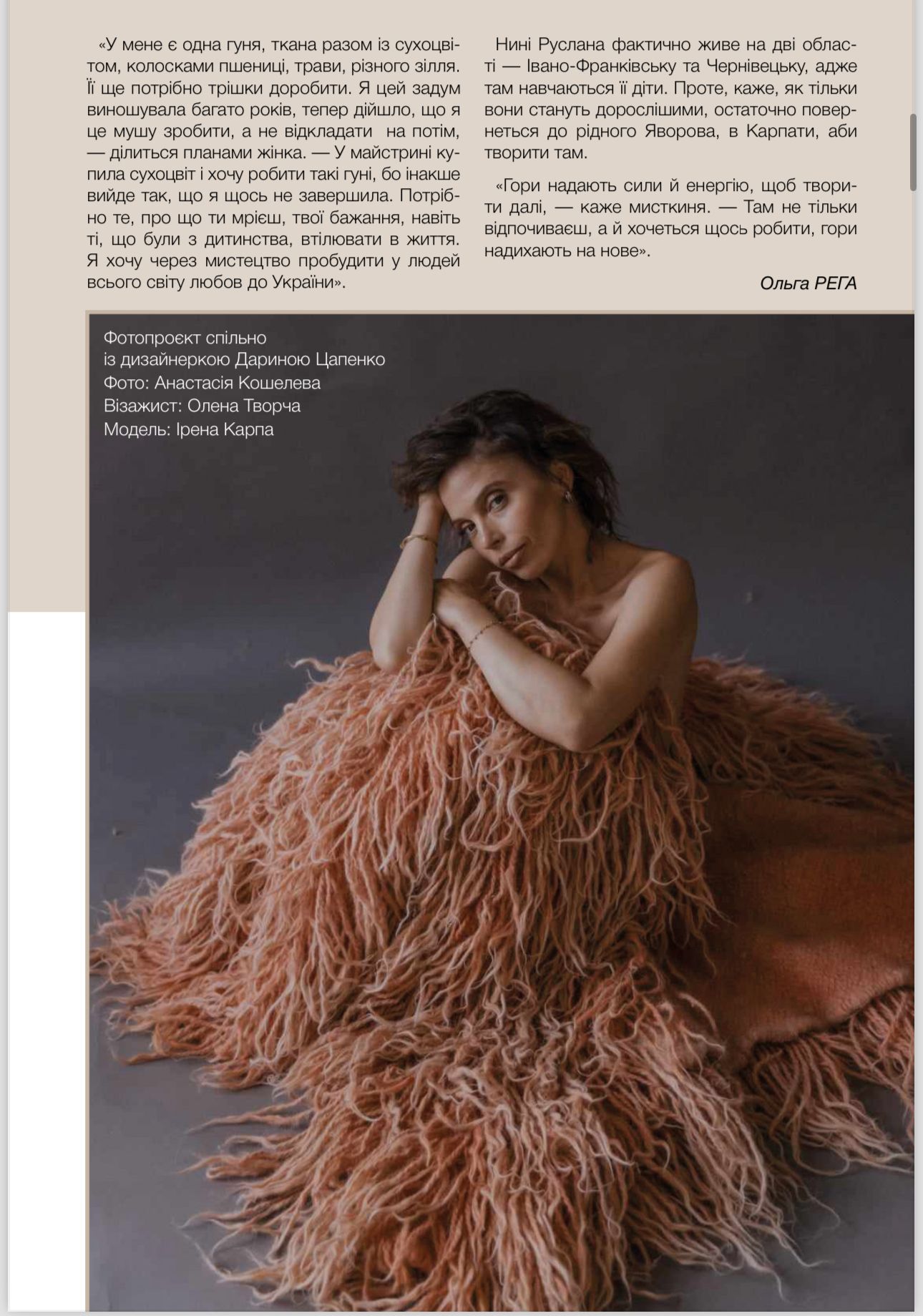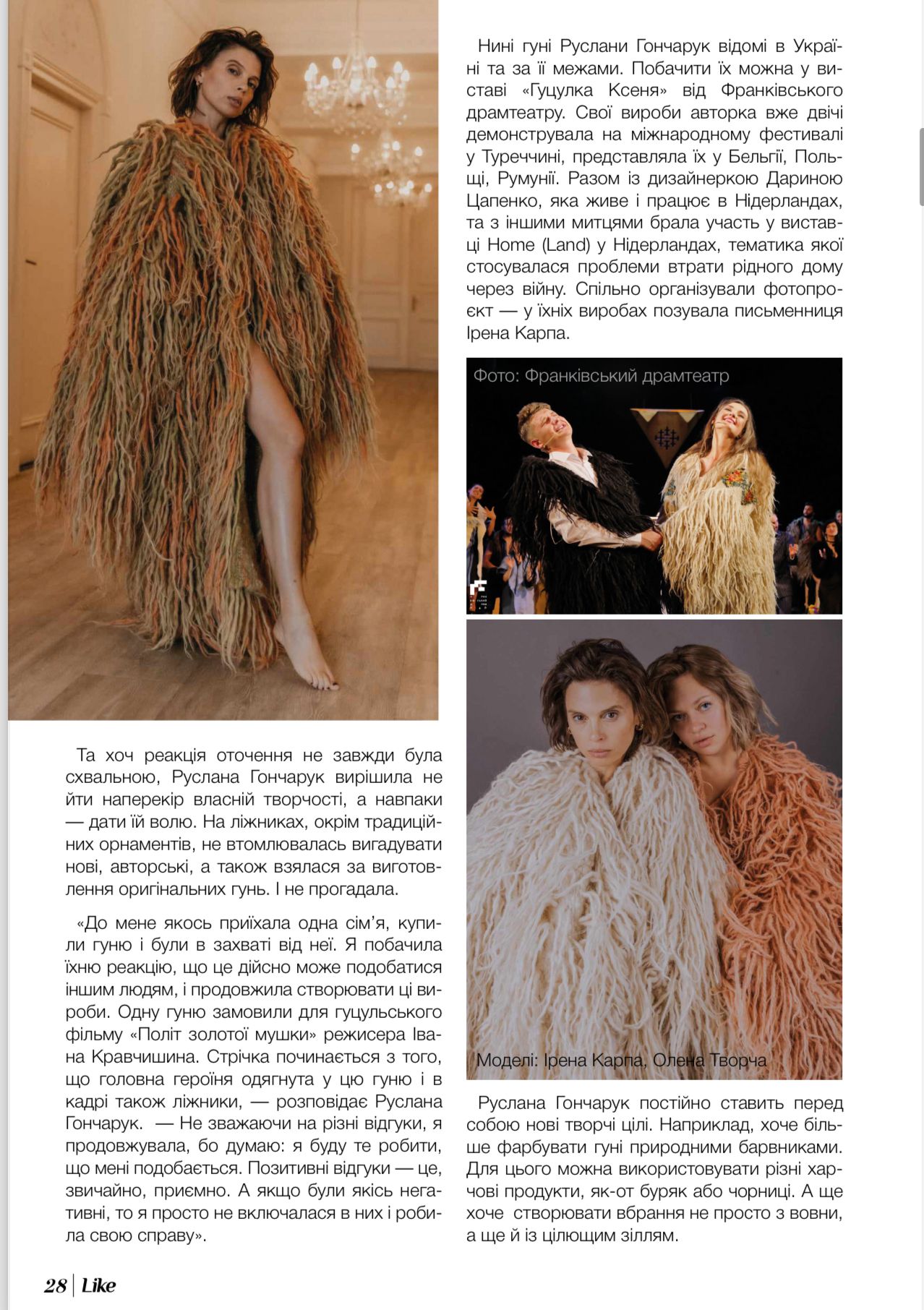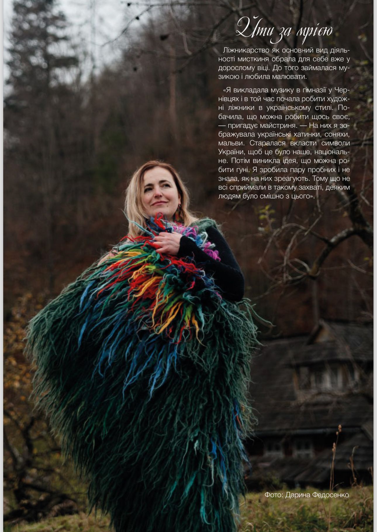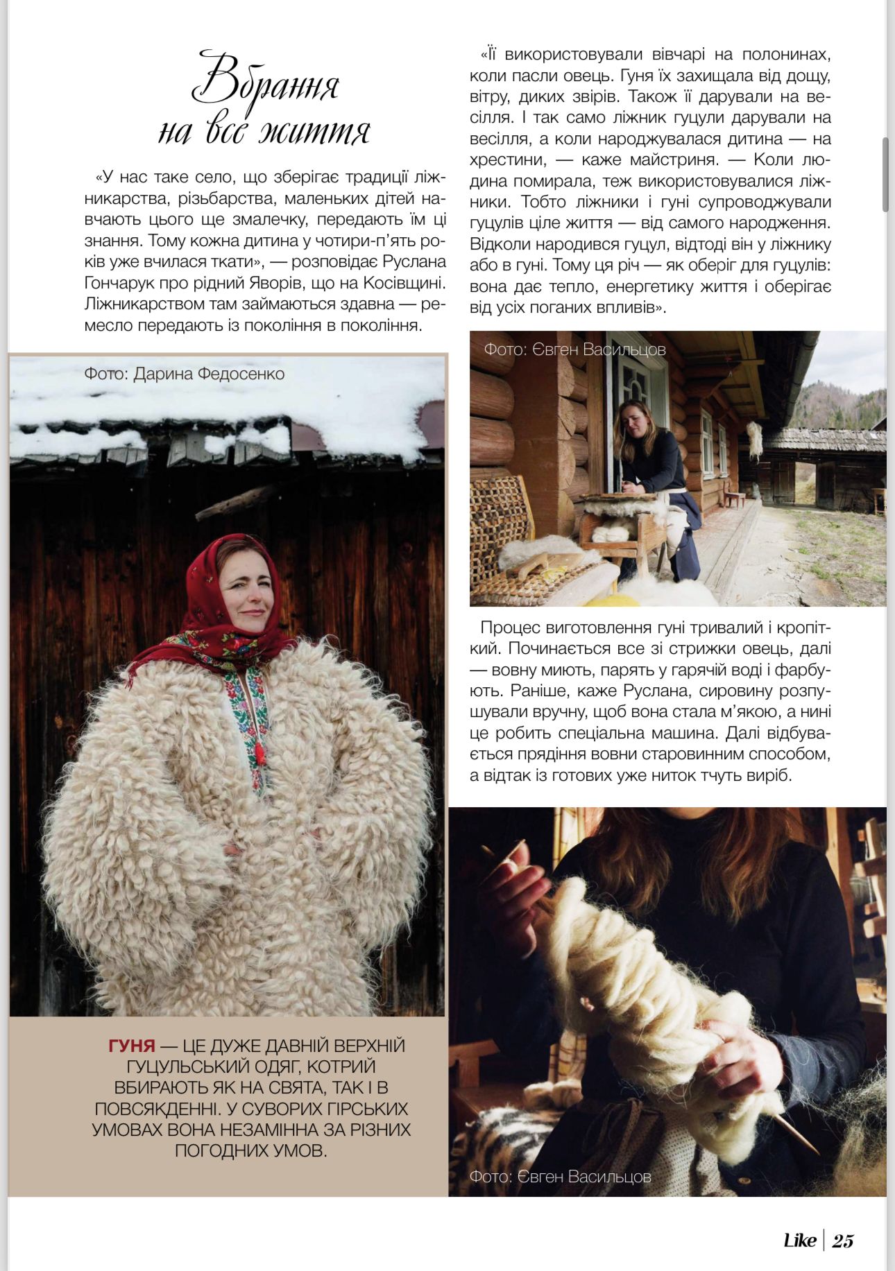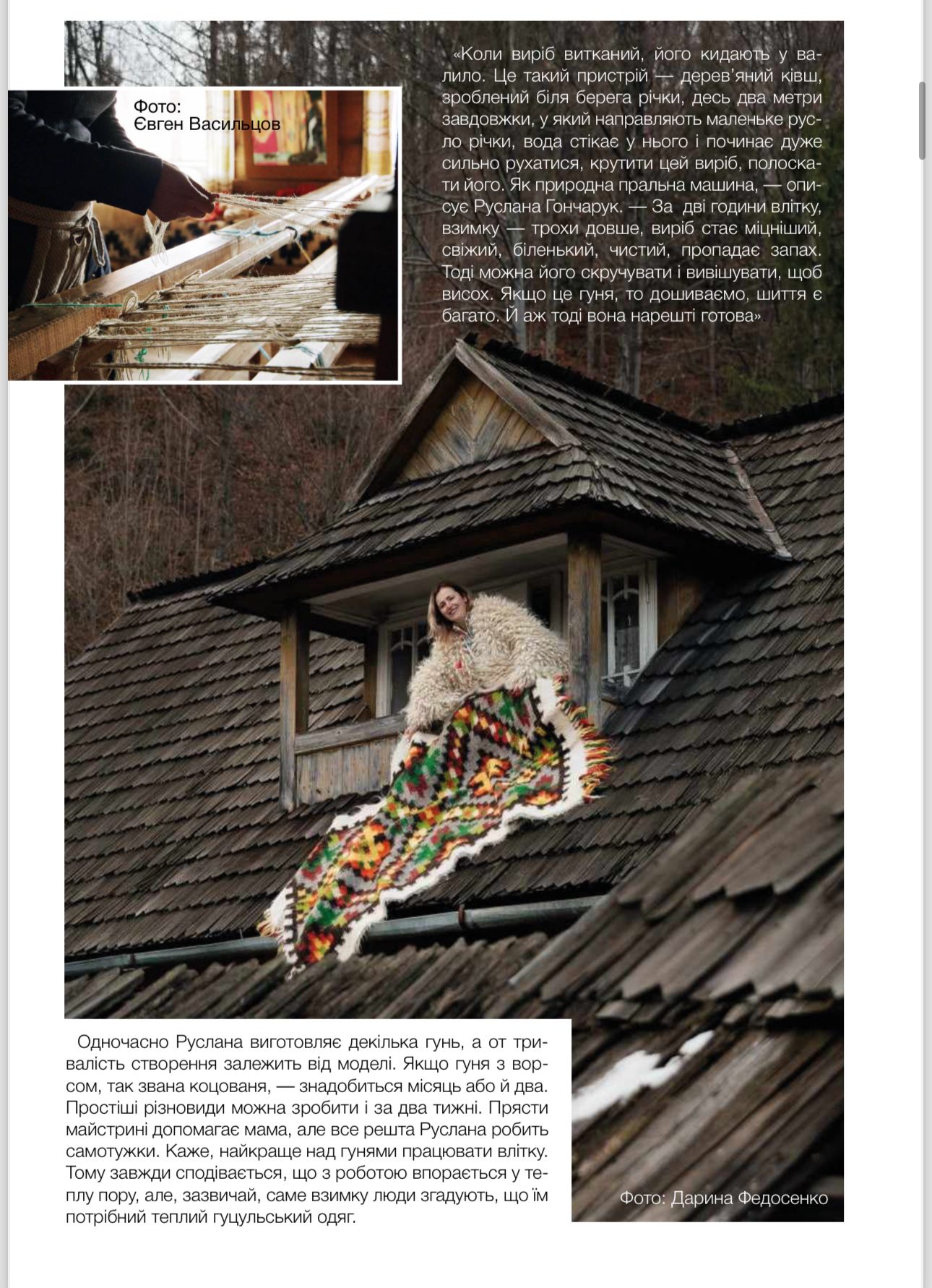 Загартовані свіжістю гірських рік, нагріті сонцем у Карпатах, вони дарують тепло і затишок навіть у найлютіші зими. Вовняні гуні та ліжники мають кількасотлітню історію та впродовж поколінь були незамінними для гуцулів. Вміння виготовляти ці вовняні вироби мисткиня Руслана Гончарук перейняла від матері, проте, попрацювавши із традиційними техніками та візерунками, вирішила йти власним шляхом і творити ексклюзивні авторські речі.