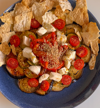 6. Коли овочі будуть готові, дати їм вистигнути декілька хвилин, а потім викласти все на тарілку, зверху додати нарізані помідори, сир та лаваш. Зверху — соус і кунжут.