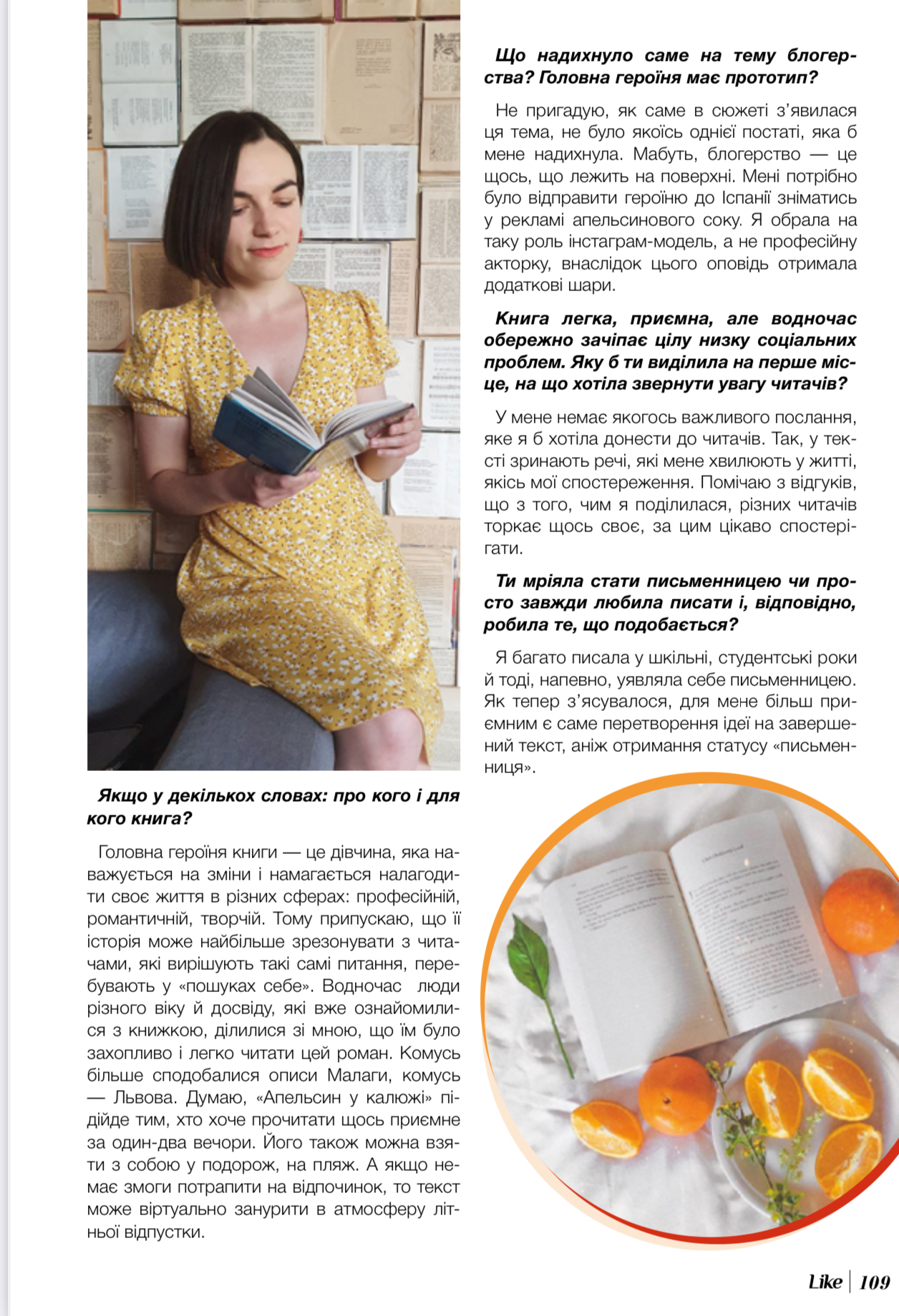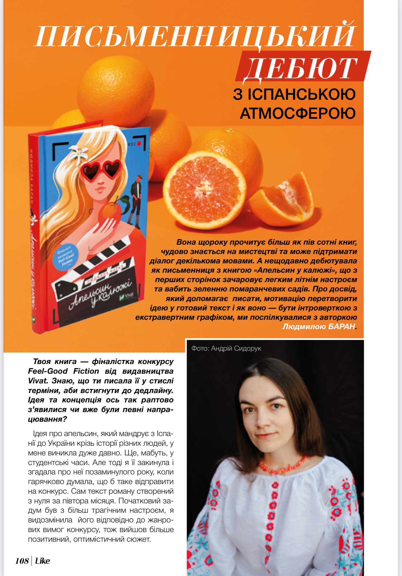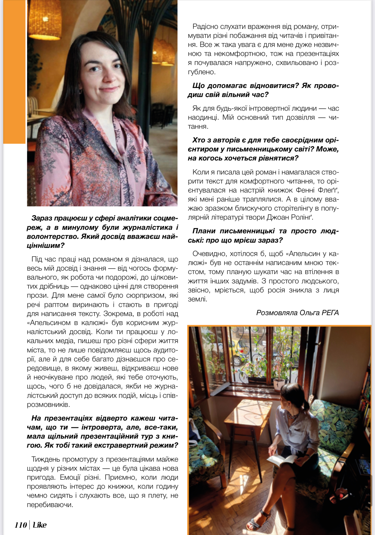 Вона щороку прочитує більш як пів сотні книг, чудово знається на мистецтві та може підтримати діалог декількома мовами. А нещодавно дебютувала як письменниця з книгою «Апельсин у калюжі», що з перших сторінок зачаровує легким літнім настроєм та вабить зеленню помаранчевих садів. Про досвід, який допомагає писати, мотивацію перетворити ідею у готовий текст і як воно — бути інтроверткою з екстравертним графіком, ми поспілкувалися з авторкою Людмилою БАРАН.