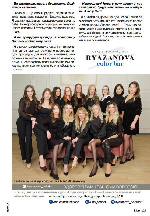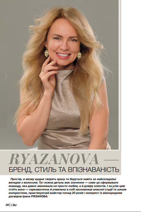 Простір, в якому щодня творять красу та беруться навіть за найскладніші випадки з волоссям. Тут кожна деталь має значення — саме це сформувало команду, яка давно завоювала не просто любов, а й довіру клієнтів. І за усім цим стоїть вона — харизматична й упевнена в собі засновниця власної студії та школи колористики, практикуючий майстер понад 20 років і колорист із міжнародним досвідом Ірина РЯЗАНОВА.