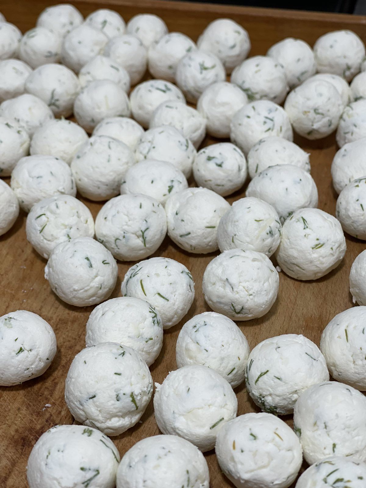 Сир, нарізану дрібно зелень та натертий часник змішуємо до однорідності та формуємо кульки.