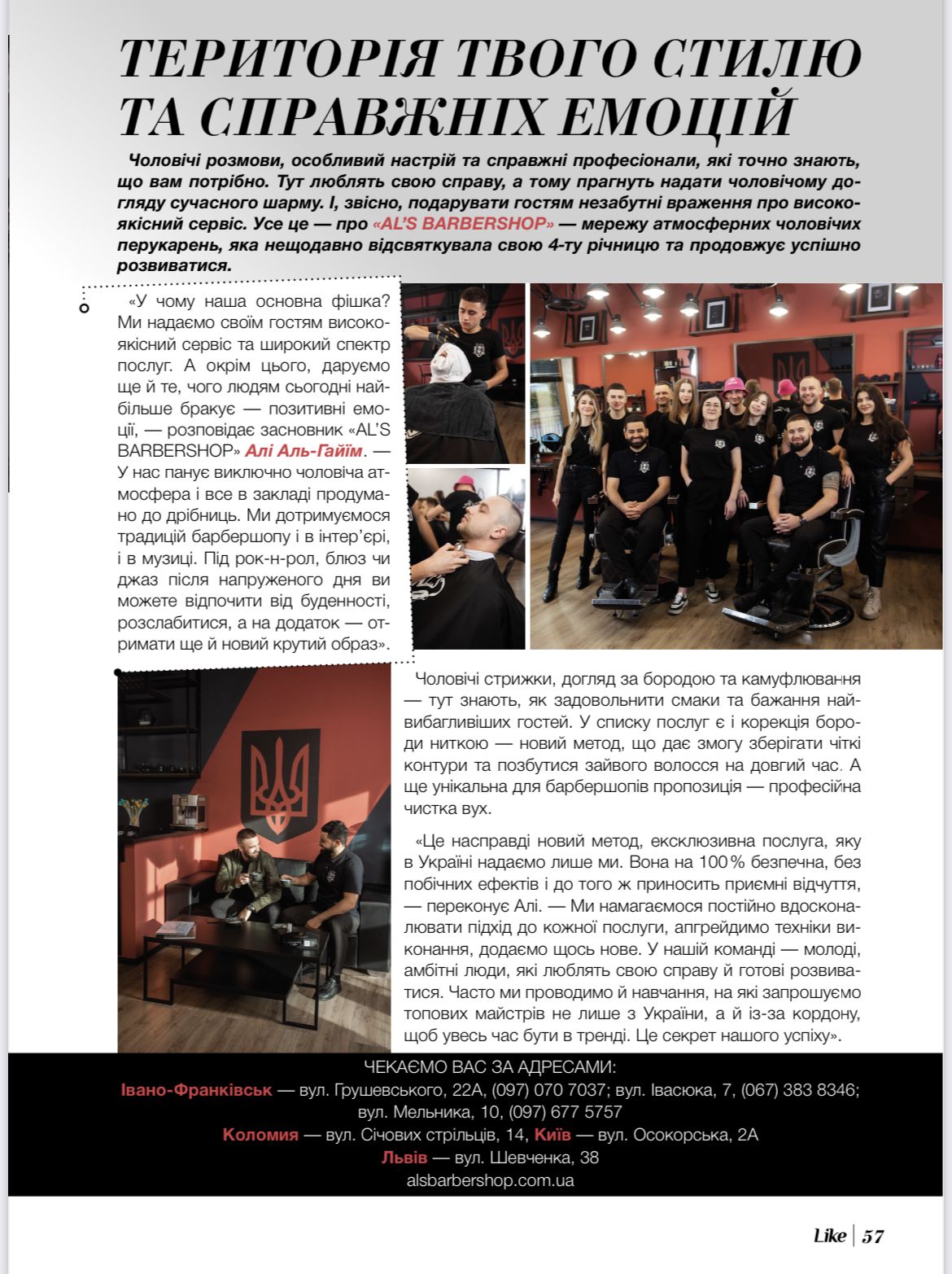 Чоловічі розмови, особливий настрій та справжні професіонали, які точно знають, що вам потрібно. Тут люблять свою справу, а тому прагнуть надати чоловічому догляду сучасного шарму. І, звісно, подарувати гостям незабутні враження про високоякісний сервіс. Усе це – про «AL’S BARBERSHOP» – мережу атмосферних чоловічих перукарень, яка нещодавно відсвяткувала свою 4-ту річницю та продовжує успішно розвиватися.