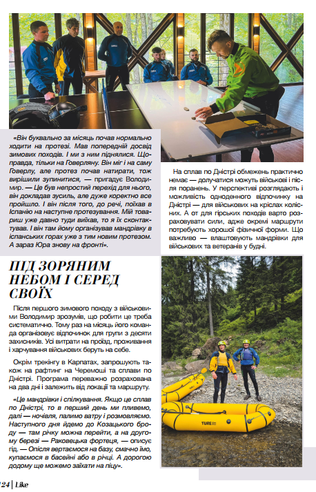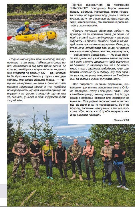 Вони організовують походи у гори та сплави по річках для військових. І хоч запевняють, що ніяких особливих реабілітаційних заходів у програму не закладають, цілюща сила природи, фізичні навантаження і середовище однодумців дають свій потужний терапевтичний ефект.