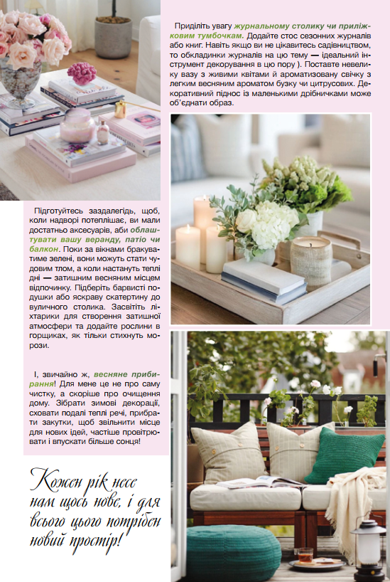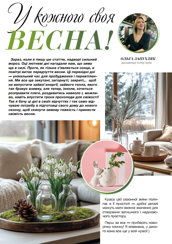 Зараз, коли я пишу цю статтю, надворі сильний мороз. Оці лютневі дні нагадали нам, що зима ще в силі. Проте, як тільки з’являється сонце, в повітрі витає передчуття весни. Ці перехідні дні — унікальний час для пробудження і перевтілення. Ми все ще закутані, загорнуті, закриті,.. щоб не випустити зайвої енергії, зайвого тепла, якого так бракує взимку, але тепер, інколи, хочеться розправити плечі, роздивитись навколо і, можливо, навіть впустити трохи прохолоди для свіжості! Так я бачу ці дні в своїх відчуттях і так само відчуваю потребу в підготовці свого дому до нового сезону, щоб скинути зимову тяжкість і принести свіжість весни.