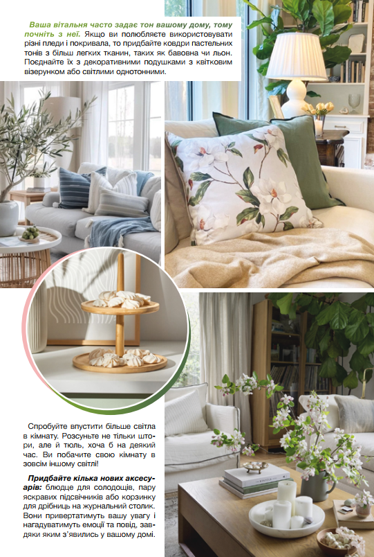 Ваша вітальня часто задає тон вашому дому, тому почніть з неї. Якщо ви полюбляєте використовувати різні пледи і покривала, то придбайте ковдри пастельних тонів з більш легких тканин, таких як бавовна чи льон. Поєднайте їх з декоративними подушками з квітковим візерунком або світлими однотонними.