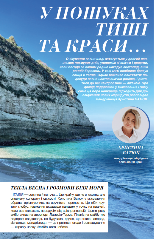 Очікування весни іноді затягується у довгий ланцюжок похмурих днів, упереміж зі снігом і дощами, коли погода за вікном радше нагадує листопад, аніж ранній березень. У такі миті особливо бракує сонця й тепла. Однак важливо пам’ятати: подекуди весна настає значно раніше, і дістатися до неї найпростіше — літаком. Про досвід подорожей у міжсезоння і чому саме ця пора найкраще підходить для дослідження нових маршрутів розповідає мандрівниця Христина БАТЮК.