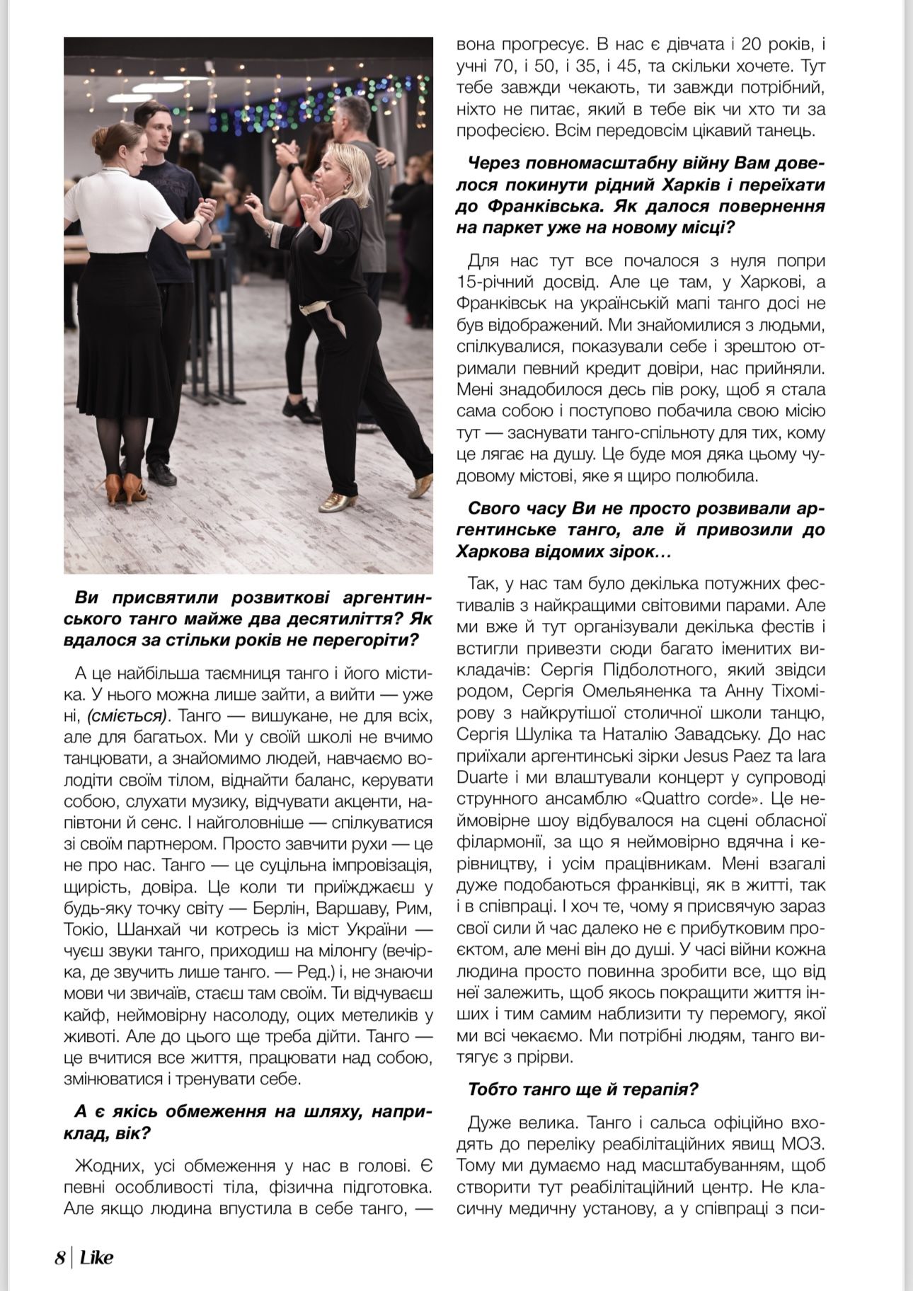 Яскрава, харизматична, неймовірно цікава і сповнена енергії. Вона з таким натхненням та непідробною щирістю розповідає про найбільше захоплення свого життя, що мимоволі починаєш одразу вірити: танго — це не просто танець, а цілий всесвіт, наповнений глибоким сенсом. Про те, як він змінює життя, лікує душевні рани та чи стане Франківськ «танго-столицею» Карпат, говоримо з хореографом, провідним викладачем аргентинського танго і засновницею Школи Танцю Л. Е. Шкробтак Оленою Лісничою.