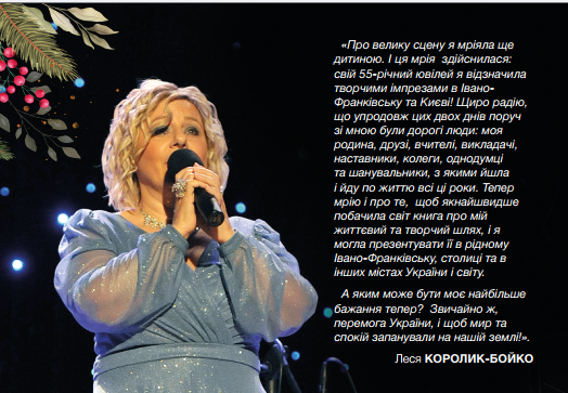 «Про велику сцену я мріяла ще дитиною. І ця мрія здійснилася: свій 55-річний ювілей я відзначила творчими імпрезами в Івано-Франківську та Києві! Щиро радію, що упродовж цих двох днів поруч зі мною були дорогі люди: моя родина, друзі, вчителі, викладачі, наставники, колеги, однодумці та шанувальники, з якими йшла і йду по життю всі ці роки. Тепер мрію і про те, щоб якнайшвидше побачила світ книга про мій життєвий та творчий шлях, і я могла презентувати її в рідному Івано-Франківську, столиці та в інших містах України і світу.А яким може бути моє найбільше бажання тепер? Звичайно ж, перемога України, і щоб мир та спокій запанували на нашій землі!»(Леся КОРОЛИК-БОЙКО).