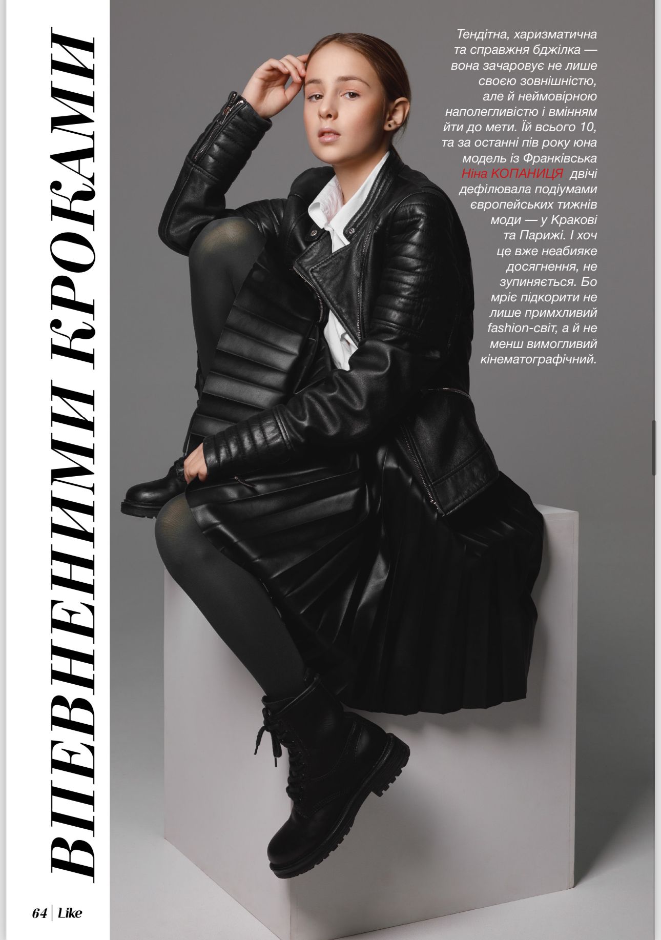 Тендітна, харизматична та справжня бджілка – вона зачаровує не лише своєю зовнішністю, але й неймовірною наполегливістю і вмінням йти до мети. Їй всього 10, та за останні пів року юна модель із Франківська Ніна КОПАНИЦЯ двічі дефілювала подіумами європейських тижнів моди — у Кракові та Парижі. Хоч це вже неабияке досягнення, не зупиняється. Бо мріє підкорити не лише примхливий fashion-світ, а й не менш вимогливий кінематографічний.