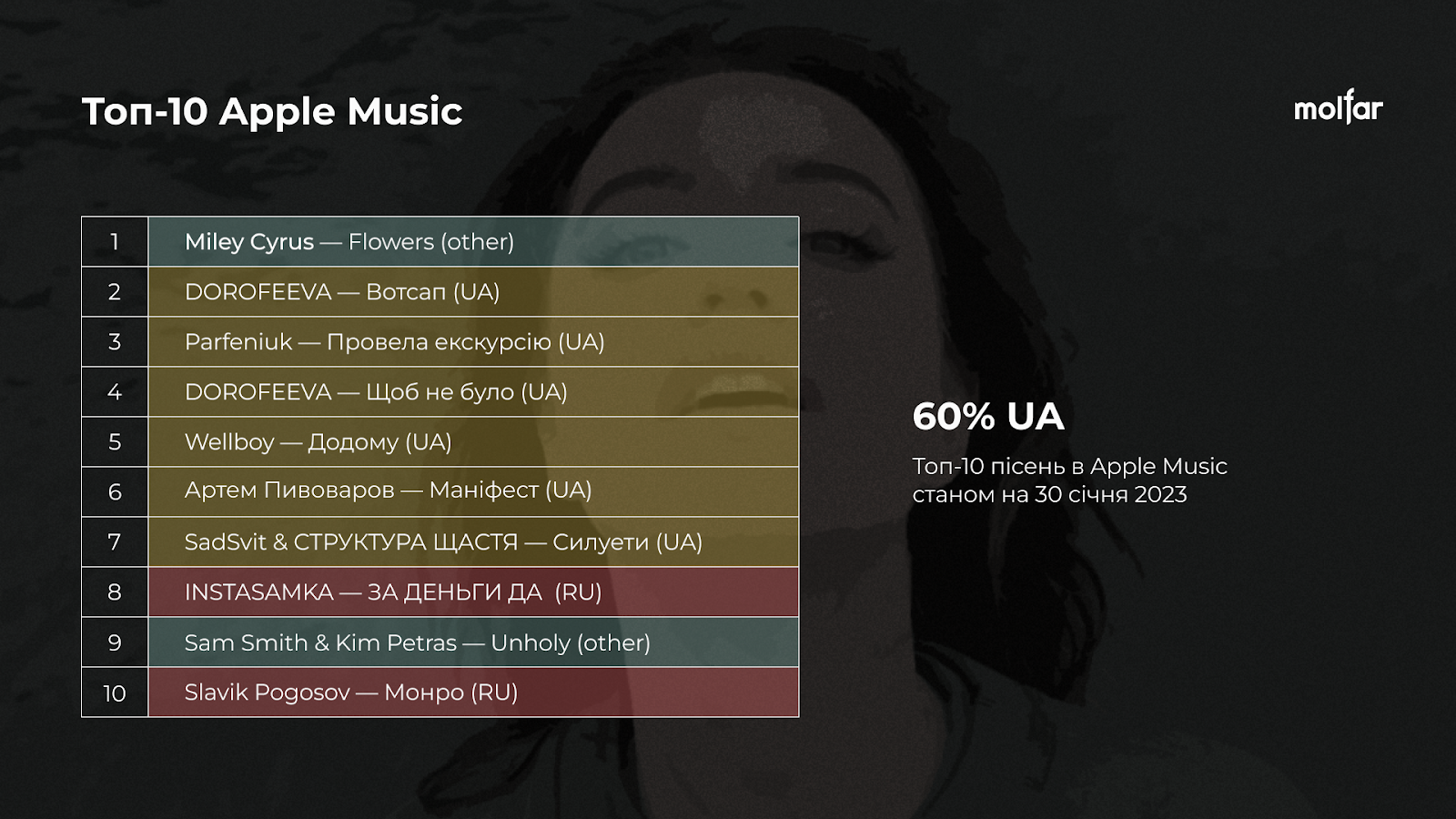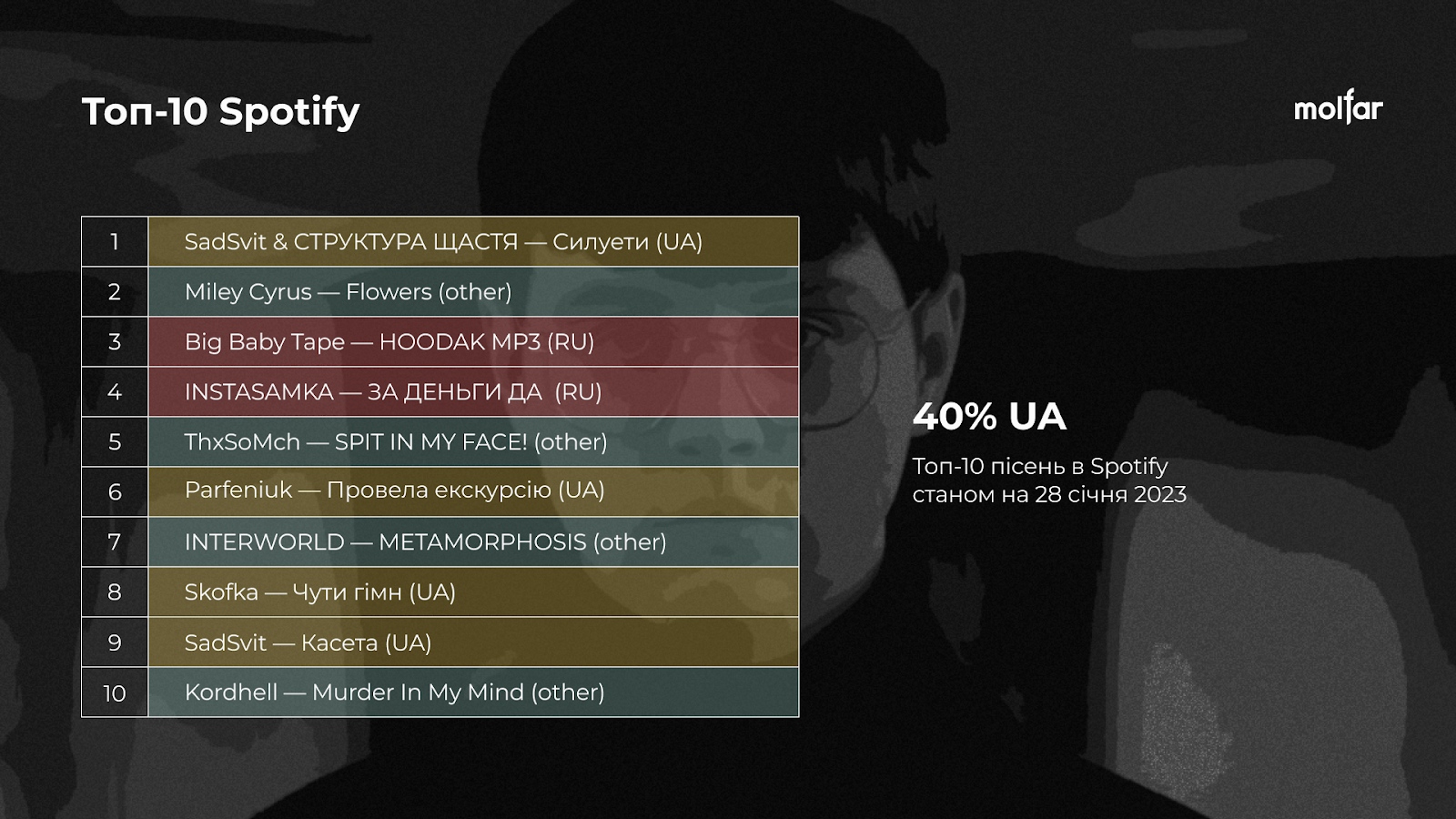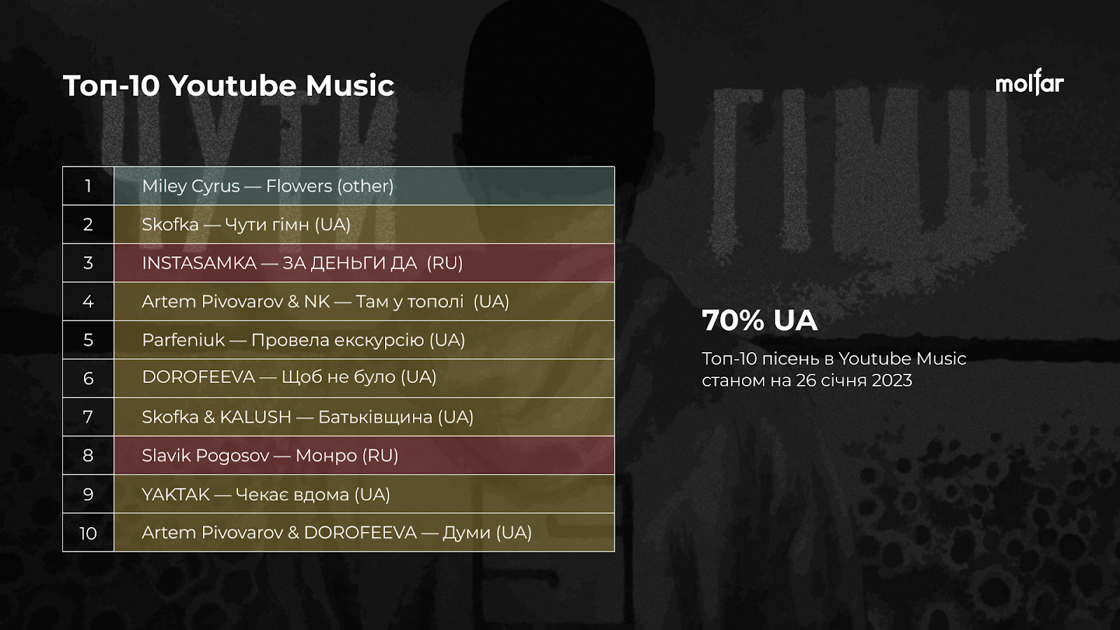 Кількість російських виконавців за друге півріччя повномасштабної війни все ще найбільша на платформах Spotify (48% у липні 2022 проти 18% у січні 2023) та Apple Music (27% у липні 2022 проти 21% у січні).