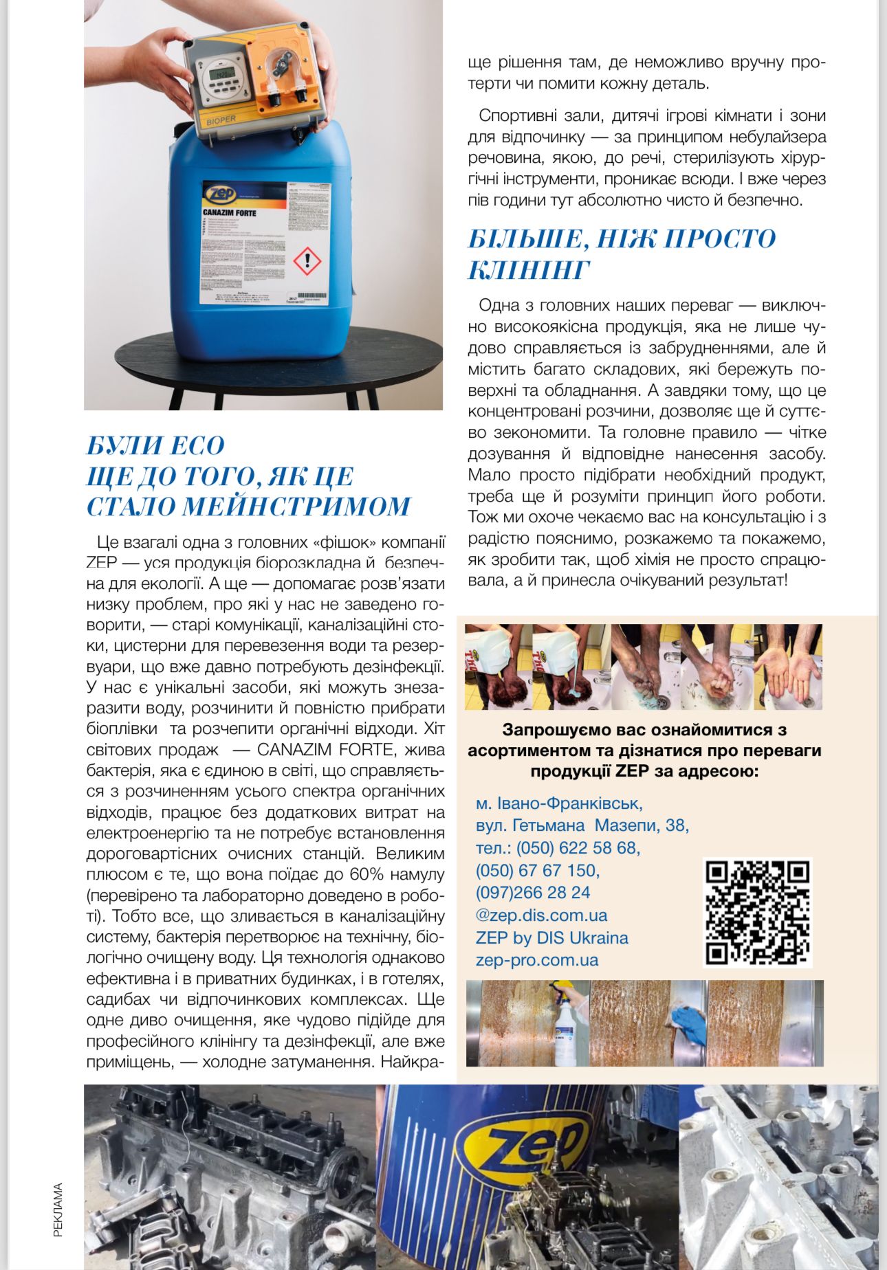 Ми представляємо продукцію всесвітньо відомої компанії ZEP, яка є виробником промислової та побутової хімії, засобів для догляду й обслуговування транспорту, механізмів та обладнання з 87-річним досвідом роботи на світовому ринку. Усі продукти розроблені спеціальною командою дослідників, а тому можуть ефективно й безпечно боротися з будь-яким забрудненням. Це ексклюзивні засоби найвищої, тобто преміум якості, аналогів яким в Україні немає.