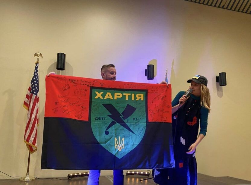 5 березня, в Нью-Йорку відбувся аукціон, на якому поет Сергій Жадан продав бойові прапори добровольчого формування «Хартія» з підписами бійців та дві свої книжки з підписом Залужного. Про це повідомляє Укрінформ.