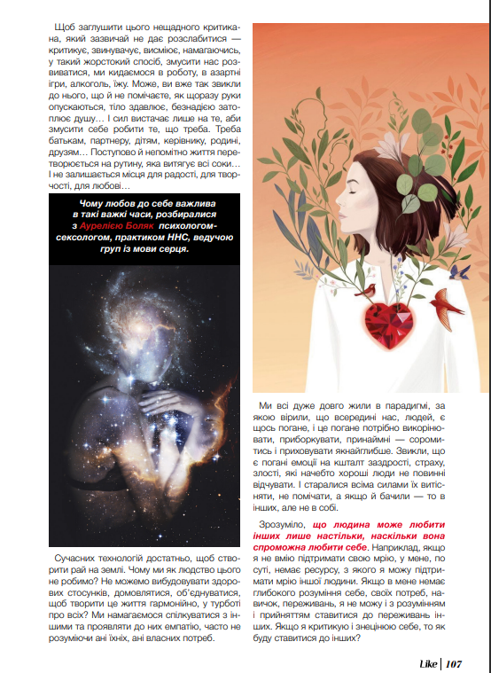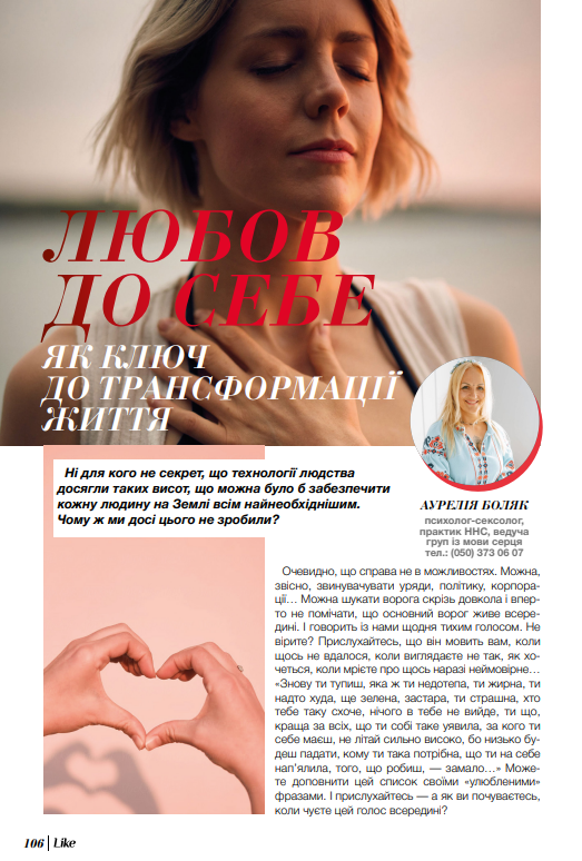 ЛЮБОВ ДО СЕБЕ 0 By Ірина Стефанюк on 27.12.2022 · Like радить, Новини Чому любов до себе важлива в такі важкі часи, розбиралися з Аурелією Боляк, психологом-сексологом, практиком ННС, ведучою груп із мови серця. Share. Twitter Facebook Google+ Pinterest LinkedIn Tumblr Email