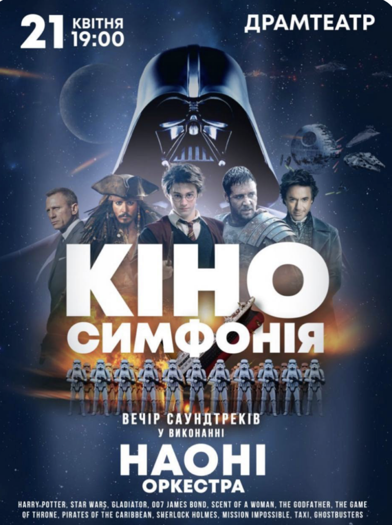 На гостей чекає захоплива подорож світом кіно – через музику, що стала символом цілих епох. У цей вечір прозвучать саундтреки з найвідоміших фільмів і серіалів, які оживуть у потужному живому виконанні.
