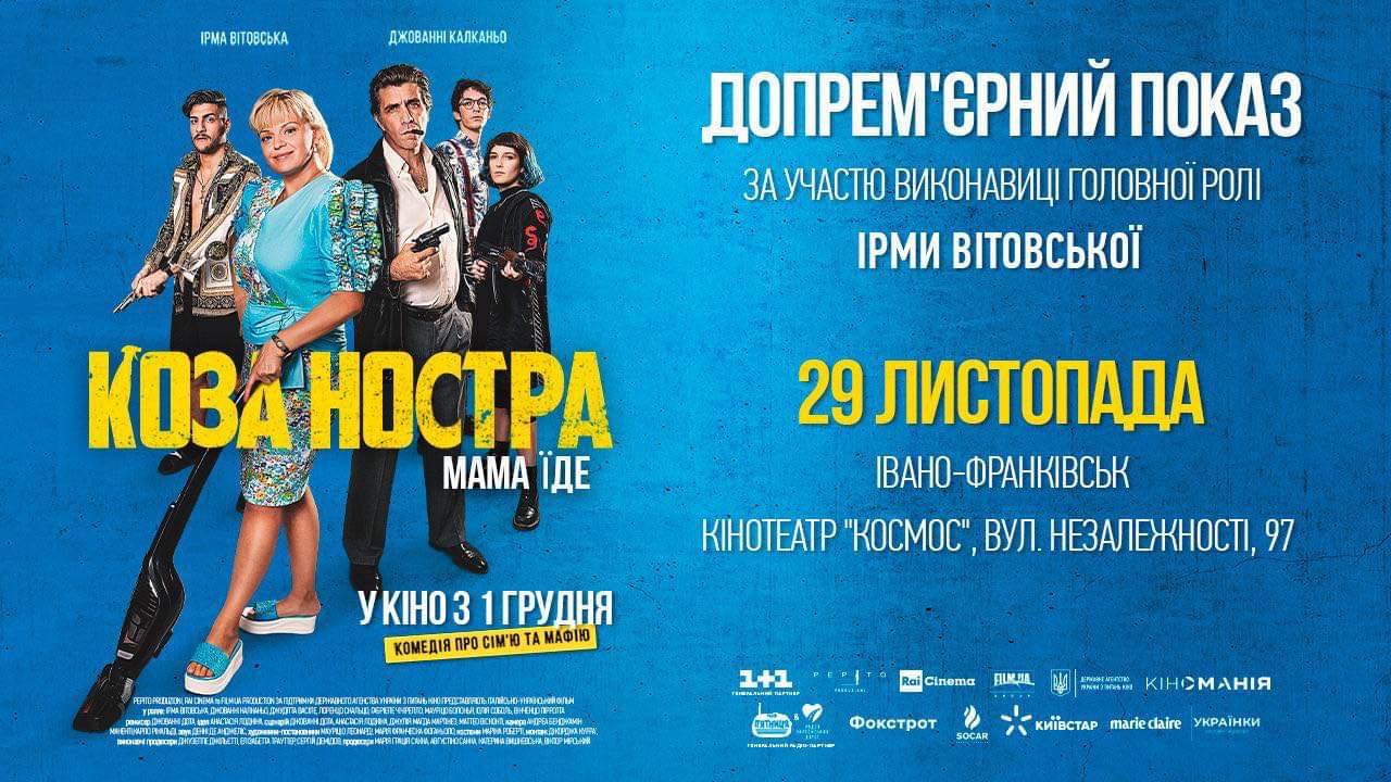 29 листопада в Івано-Франківську відбудеться перший в Україні показ україно-італійської комедії «Коза Ностра. Мама їде». Головну роль в цьому фільмі про сім’ю і мафію виконала неперевершена Ірма Вітовська – видатна українська актриса, уродженка Івано-Франківська та володарка двох премій «Дзиґа» за кращу жіночу роль.
